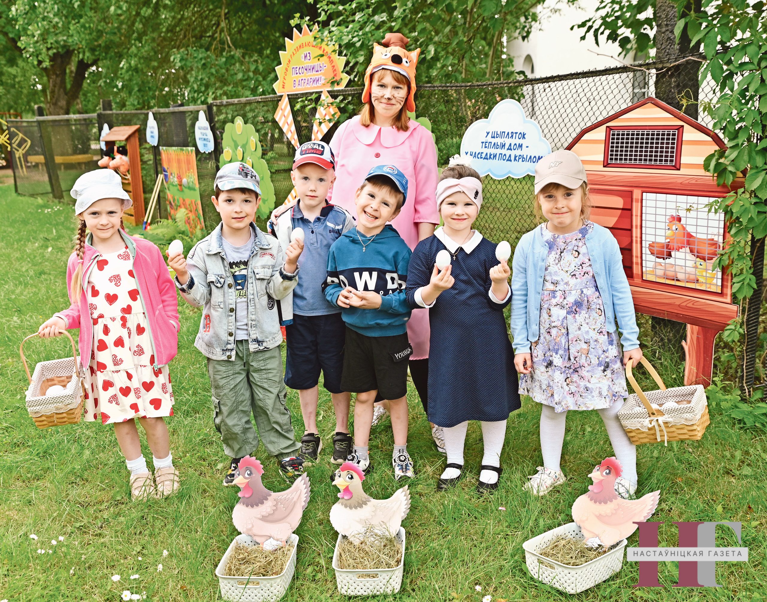 Широкую панораму того, чем можно заниматься с детьми под открытым июньским небом, продемонстрировал Кировский детский сад Витебского района. Стационарное игровое оборудование успешно дополняется переносным, которое используется для занятий спортом, творчеством, строительства замков из мягких блоков и даже профориентации. В ясные летние дни здесь разворачивают игровой развивающий комплекс “Из песочницы — в аграрии”. Детям предлагают собрать с больших игрушечных деревьев яблоки, с огорода, роль которого выполняет обтянутая мягкой тканью площадка с выемками, — овощи. А на симпатичной птицеферме малыши бережно складывают в корзинки муляжи куриных яиц курочек-несушек.