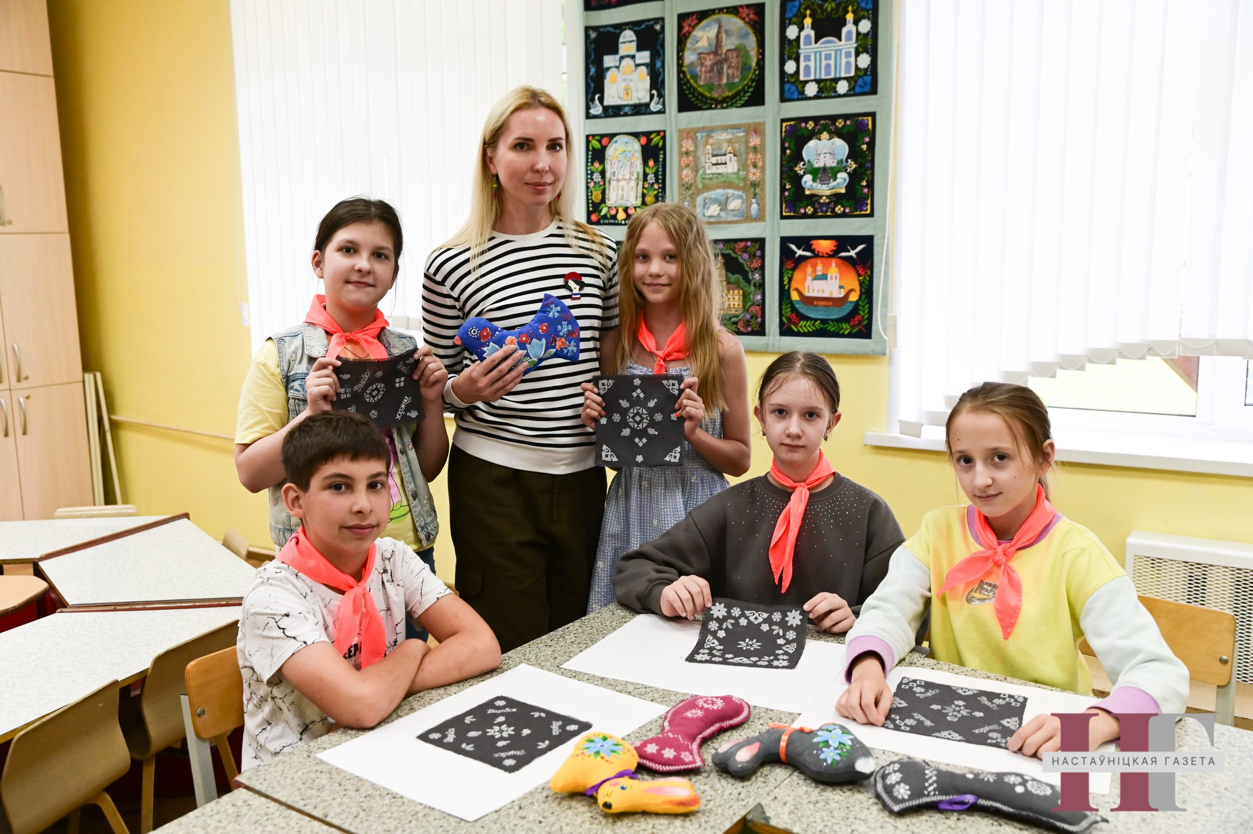 Во время посещения филиала “Созвездие” Витебского городского центра дополнительного образования детей и молодежи мы попали на увлекательный мастер-класс по созданию белорусской набиванки, который педагоги проводили для участников воспитательно-оздоровительного лагеря художественного профиля “Арт-территория”. Его посещают юные таланты, занимающиеся в кружках изобразительного искусства. Работают два отряда “АРТ-парус” и “АРТисты”, в каждом по 12 человек. Как рассказала начальник лагеря Ольга Орловская, их смена называется “С мольбертом вокруг света”, дети изучают культурные особенности разных стран. Так, на днях Японии они рисовали аниме, кимано и вееры, на днях Италии — венецианские карнавальные маски и пиццу. А в белорусские дни с удовольствием осваивают техники украшения ткани, которые практиковали наши предки, знакомятся с другими художественными традициями родного края.