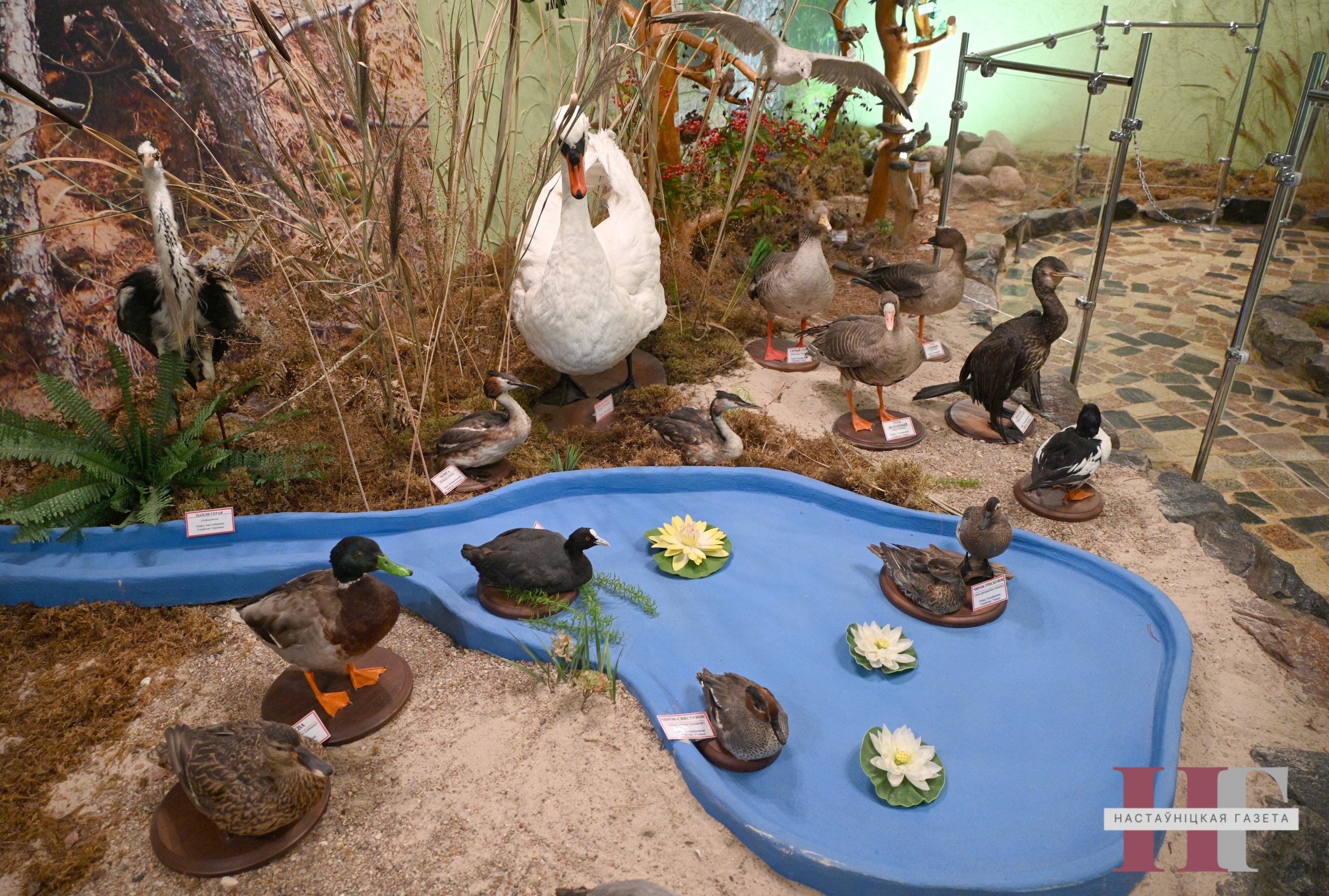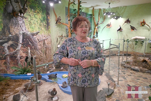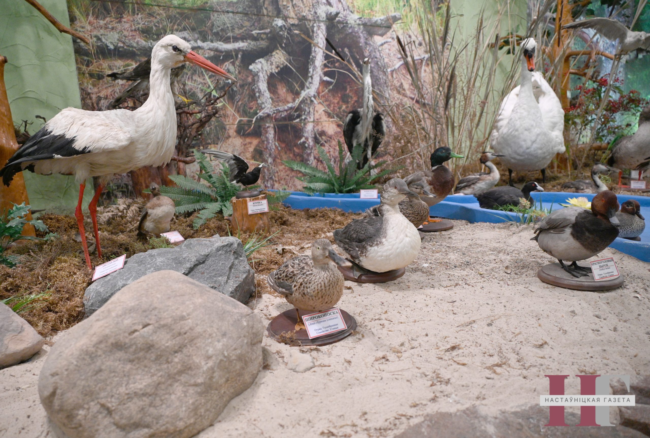 — Падчас знаёмства з раздзелам “Дзённыя і начныя драпежныя птушкі” расказваю, што іх відавы склад вельмі разнастайны. Падрабязна спыняюся на характарыстыцы савы балотнай, пугача, — працягвае знаёміць з адметнасцямі музея настаўніца. — Наступны раздзел — “Вадаплаўныя птушкі”. Тут самая багатая калекцыя. Звярніце ўвагу на імправізаваны вадаём, на якім сядзіць лысуха. Гэтая чорная птушка з белай дзюбай будуе гняздо літаральна на вадзе. Тут і лебедзь, а побач адзін з сімвалаў Беларусі — бусел. Пераходзім да птушак лесу: глушэц, цецярук, рабчык, курапатка. Асобна вядзём аповед пра птушак антрапагеннага ландшафту — сароку, каўку, шэрую варону, крумкача.