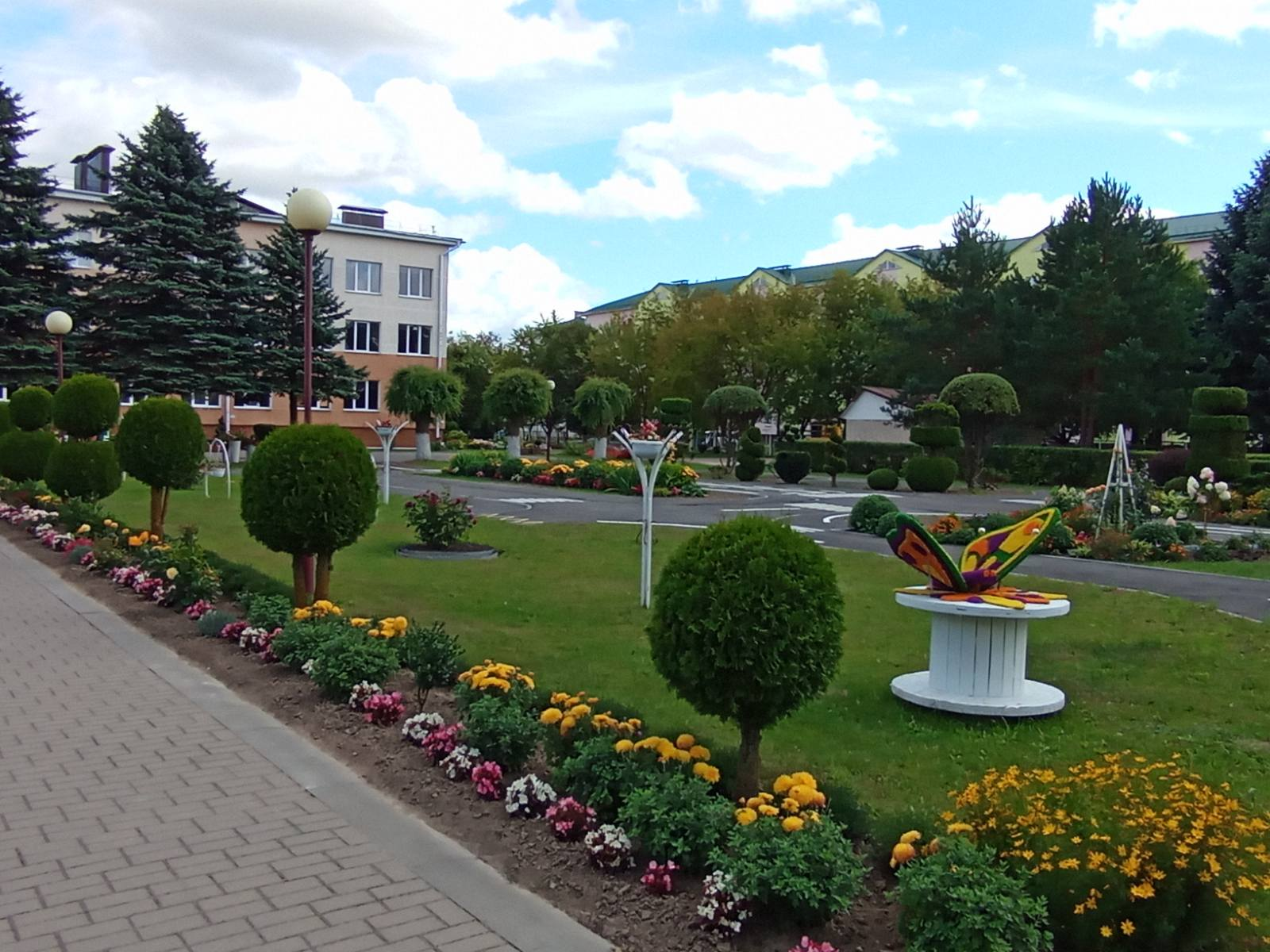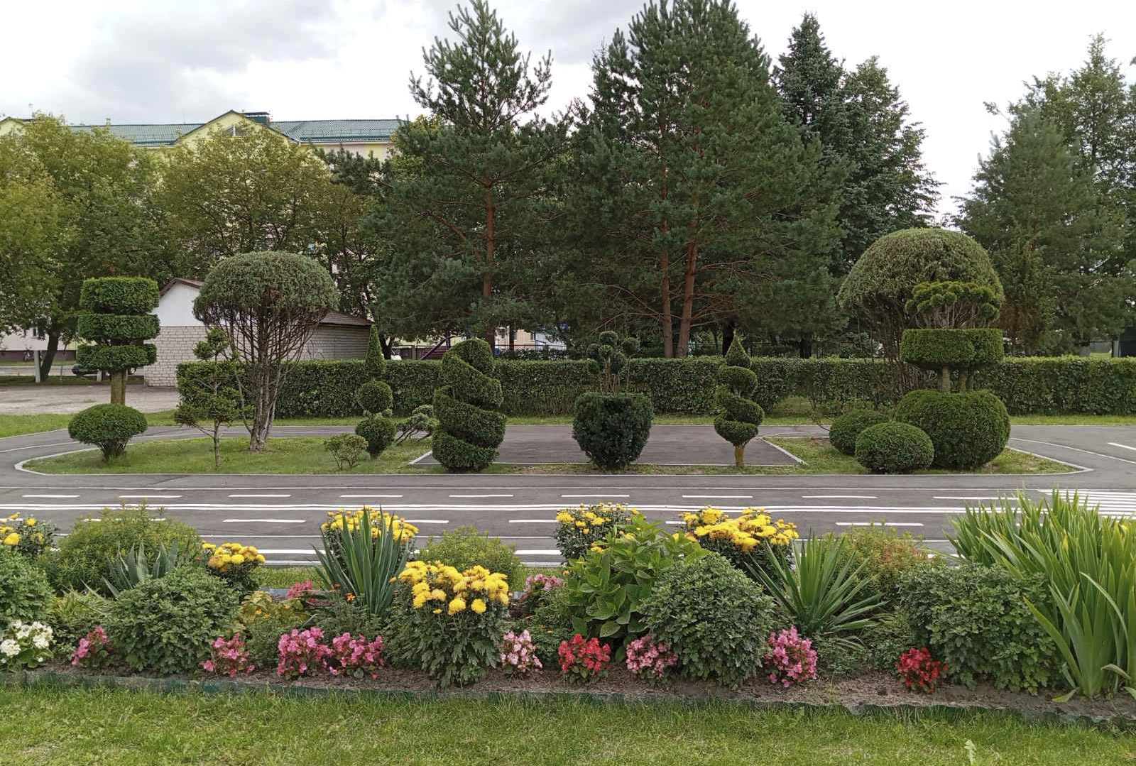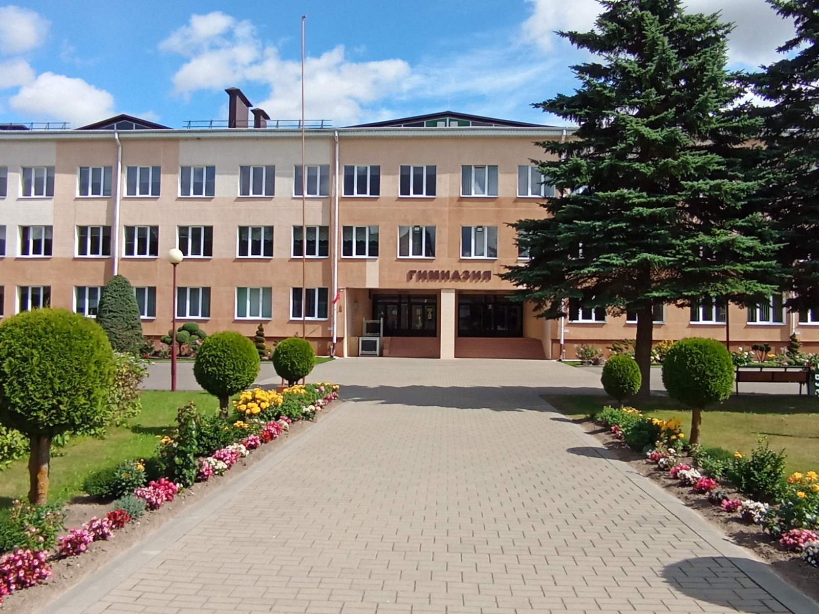 Нядзіўна, што на тэрыторыі гімназіі шмат кветнікаў. Тут і ружы, і лілеі, і касачы, і хрызантэмы, і півоні, і флёксы, і петуніі, і шыпшына… Не застаюцца без увагі і малыя архітэктурныя формы: альтанкі з падвеснымі кашпо, горка з машынкай, аркі з пляцістымі ружамі, а таксама рамантычны матылёк і маляўнічая эмблема ўстановы “У будучыню — разам”. Добра ўпісваюцца ў ландшафт два штучныя вадаёмы з дэкаратыўнымі элементамі і безліч хвойнікаў (лістоўніцы, туі, ядлоўцы, сосны, яліны), якія, дзякуючы спецыяльнай стрыжцы, штогод набываюць новыя формы.