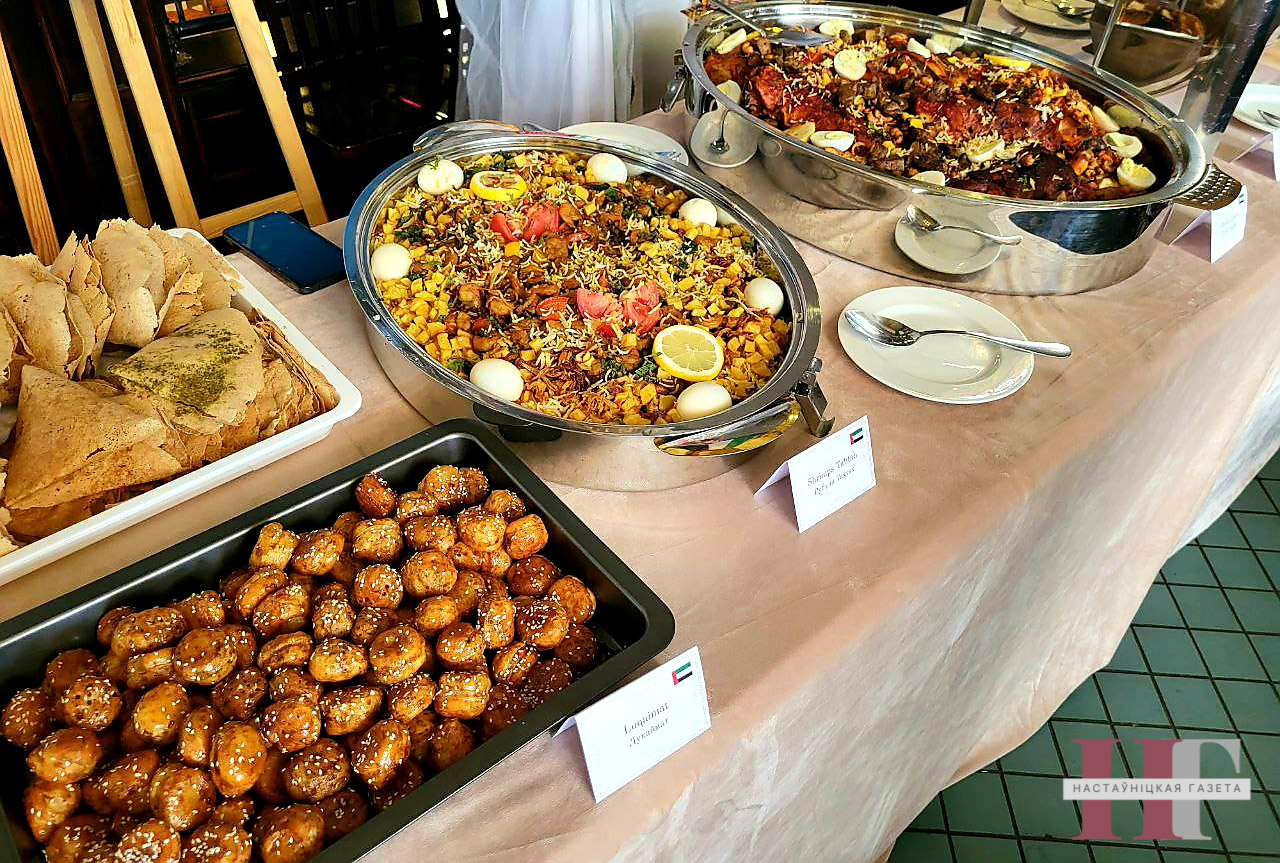 В кухне ОАЭ традиционно присутствовало много морепродуктов, а также восточных сладостей: например лукаймат — арабские пончики в сиропе. Посольство Российской Федерации угощало присутствующих фаршированными поросенком и уткой, традиционными блинами и даже малосольными огурцами. А рядом далекое Зимбабве презентовало маленькую сушеную, но очень вкусную рыбку, которая водится в великих озерах страны. А еще садзу (лепешку из кукурузной муки) и нхопи (тыквенную кашу).