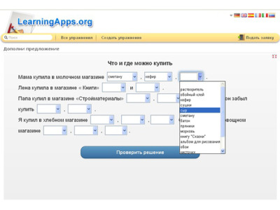 Некаторыя заданні Ганны Францаўны можна знайсці ў інтэрнэт-партале LearningApps.org, іх навучэнцы могуць выконваць толькі на камп’ютары, з якога ёсць выхад у інтэрнэт. Напрыклад, заданне “Дапоўні сказ”. Педагог пачынае сказ, а навучэнцы яго працягваюць. Прычым першы сказ павінен быць простым з аднароднымі членамі і без злучнікаў. Навучэнцы занатоўваюць: “Мама купіла ў малочным магазіне …, …, … ”. Другі сказ можа быць простым з аднароднымі членамі і са злучнікам. “Лена купіла ў магазіне кнігі … і … ”. Трэці і чацвёрты сказы павінны быць складанымі без злучніка і са злучнікам. “Тата купіў у магазіне будматэрыялы …, …, …, але ён забыў купіць …, …”. “Я купіў у хлебным магазіне …, …, а бабуля купіла агародніну …, …, …”. Апошні сказ дзеці запісваюць у сшытак.