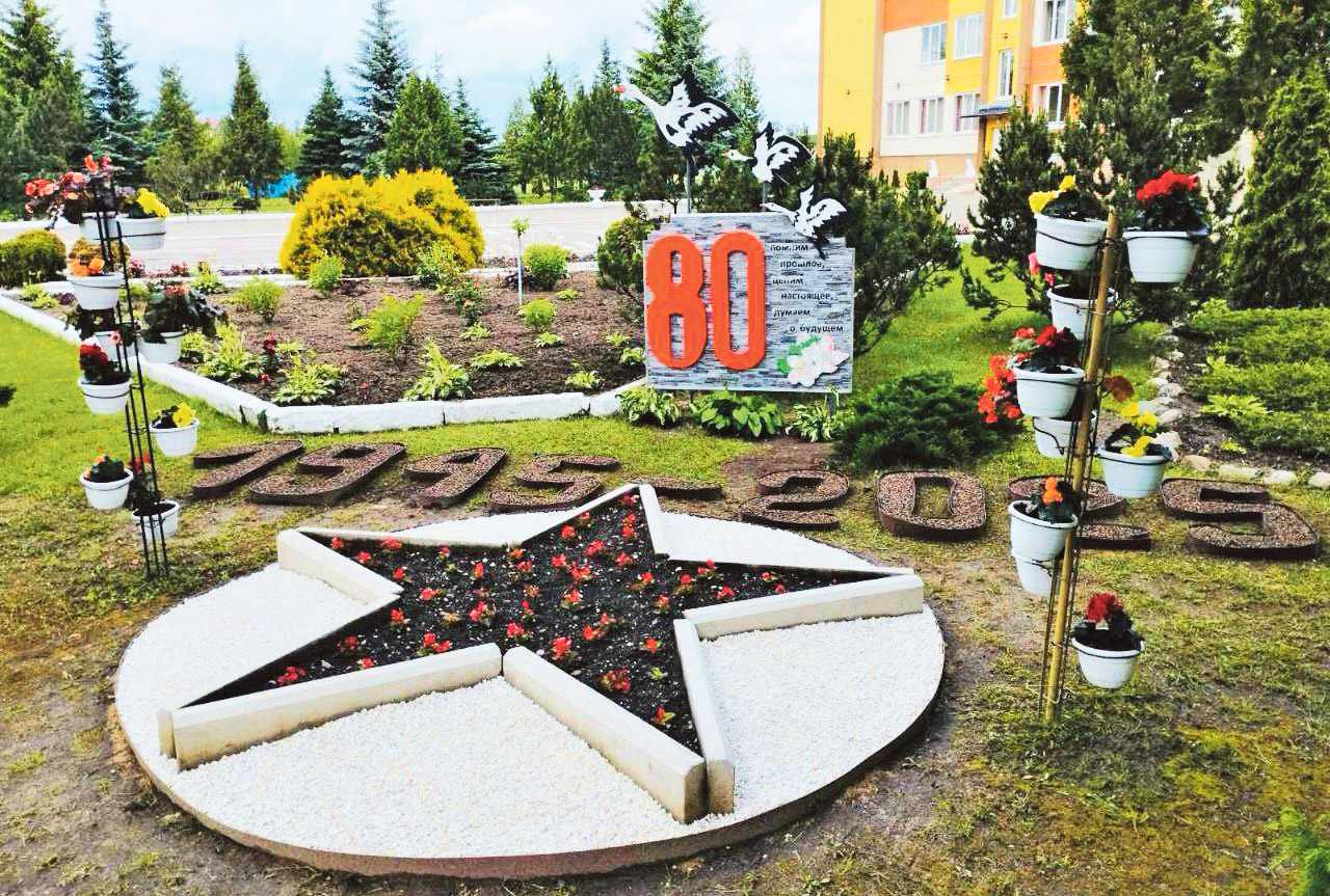 Побач банер з лічбай 80, словамі “Помним прошлое, ценим настоящее, думаем о будущем” і сілуэтамі жураўлёў, гледзячы на якія згадваеш словы знакамітай песні Марка Бернеса “Жураўлі”.