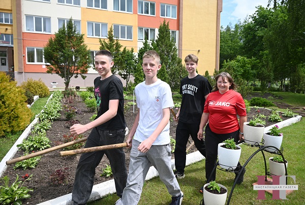 Не толькі дзяўчаты, але і хлопцы пад кіраўніцтвам настаўніцы фізічнай культуры і здароўя Алесі Леанідаўны Хлусавай шчыруюць на прыгожых рознакаляровых клумбах, паведамляе карэспандэнт “Настаўніцкай газеты”.