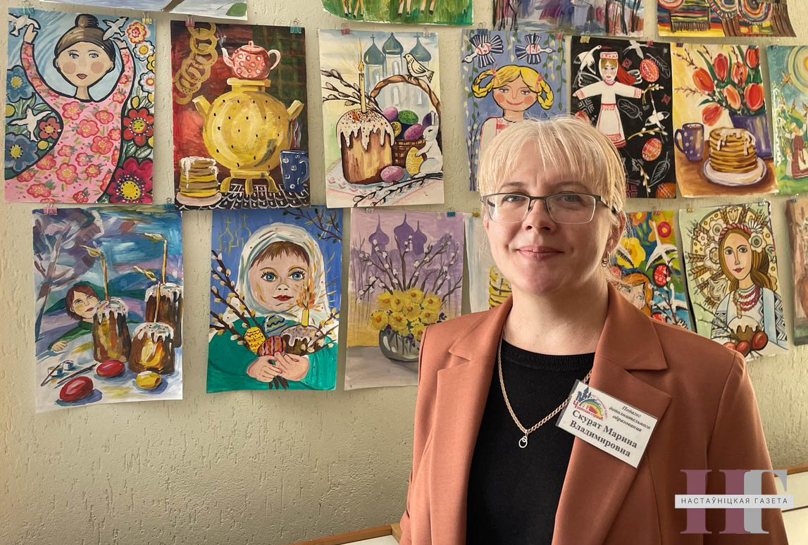 «Вось тут мы прывіваем дзецям любоў да мастацтва, прытым выкарыстоўваем і мясцовыя напрацоўкі майстроў: каб не забываліся юныя творцы на вытокі нашай культуры», — паказвае майстэрню Марына Уладзіміраўна. З радасцю засяроджвае ўвагу на работах, у якіх адчуваецца пераемнасць, каларыт народнага мастацтва. Заўважае, што любому педагогу — як бальзам на душу, калі ў выхаванцаў атрымліваюцца ўдалыя, арыгінальныя карціны.