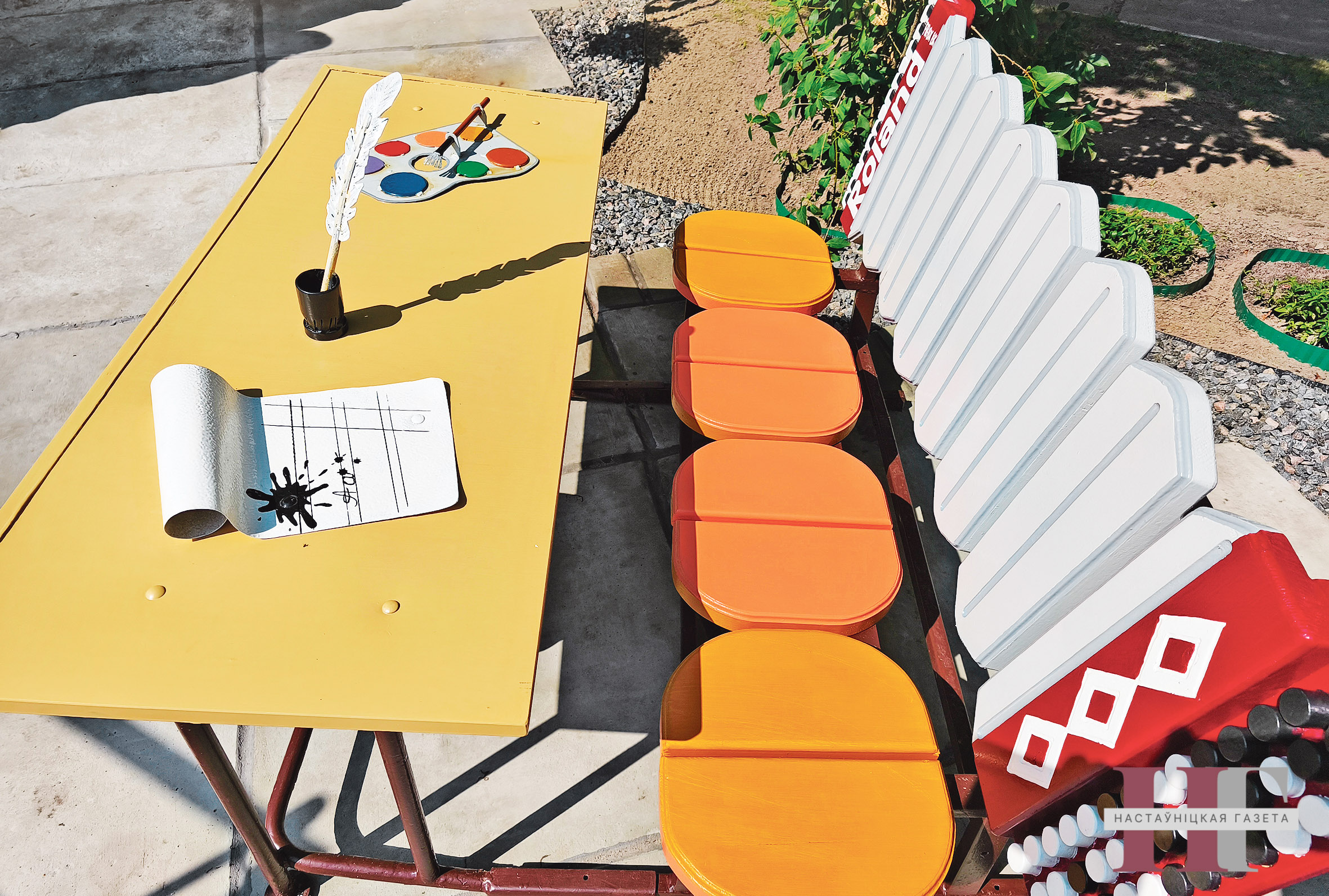 — Обрамление по контуру из каменной крошки визуально выделяет и подчеркивает гармонию нового объекта с металлоконструкциями, — подробно описывает каждую деталь собеседник. — Входная зона, словно портал, символизирует переход в мир знаний. Школьная доска встречает лозунгом “Я люблю Беларусь!”. Обратите внимание на учительский стол, где основания сделаны в виде цифр и букв. Это отсылка к тому, что знания, которые дает учитель, — надежная опора в жизни каждого человека. А предметы на столе, включая классный журнал, указку и стильные очки, ассоциируются с представителями сферы образования. Контуры класса завершают многоугольные клумбы с цветами. Первая парта фотозоны выполнена в виде музыкальных инструментов — аккордеона и барабана, символизируя уроки музыки и искусства. На столе расположены краски и кисть, развернутый лист бумаги в виде свитка, чернильница и перо — все это отражает исторический взгляд на учебу. Кляксы и каракули напоминают о детской неуверенности. У основания парты футбольный мяч, подчеркивающий, что наши ученики дружат со спортом и ведут здоровый образ жизни. Сиденье второй парты оформлено в виде карандашей. На парте лежит открытый ноутбук, означающий, что в современном технологичном мире нельзя останавливаться на месте — важно постоянно развиваться и расширять свои знания. У основания этой парты находится интересная деталь — магнит, который здесь не случайно: он указывает на сильнейшее притяжение всех, кто когда-либо учился в Заширской средней школе и всегда рад встрече с любимыми педагогами.