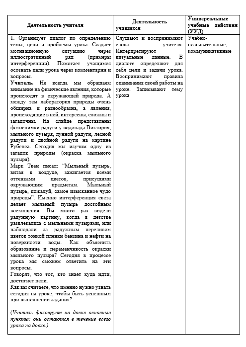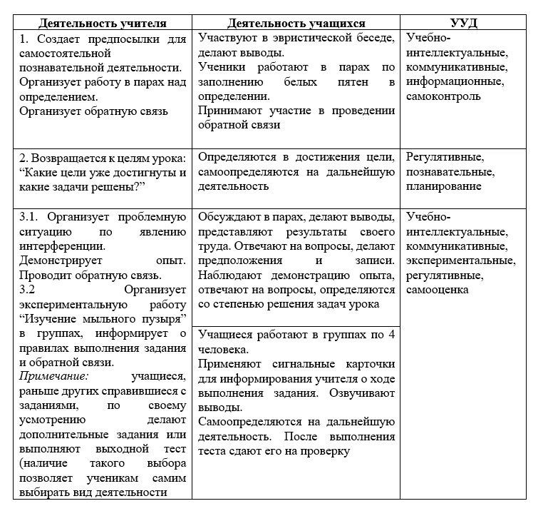 Тема: “интерференция света”, 11 класс (фрагмент схемы урока)