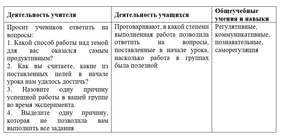 Ожидаемый результат: осознание результативности своей деятельности, осведомленность учащихся и учителя о достижении поставленных целей. Правильно сформулированные выводы продемонстрируют умение учащихся применять полученные знания при выполнении заданий.