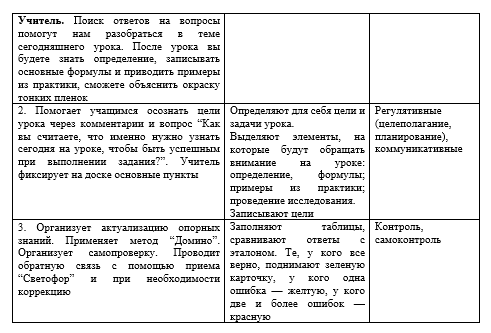 Функциональная грамотность не развивается между делом. Чтобы уроки работали на нее, добавьте в план урока отдельную колонку “Компетенции” или “УУД” (приложение 2). Это поможет не забывать о целях, направленных на развитие функциональной грамотности. Или, например, в сценарий вставьте следующий фрагмент: