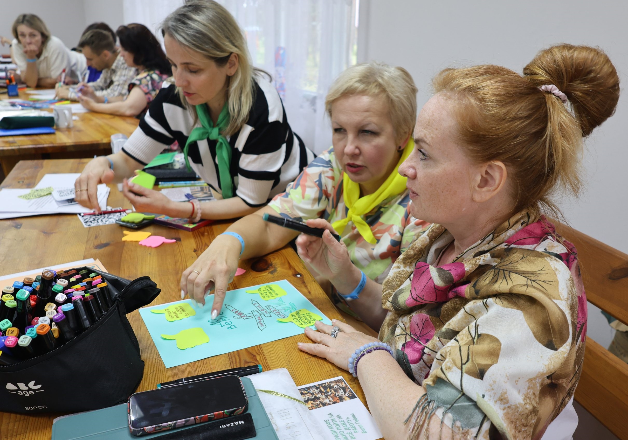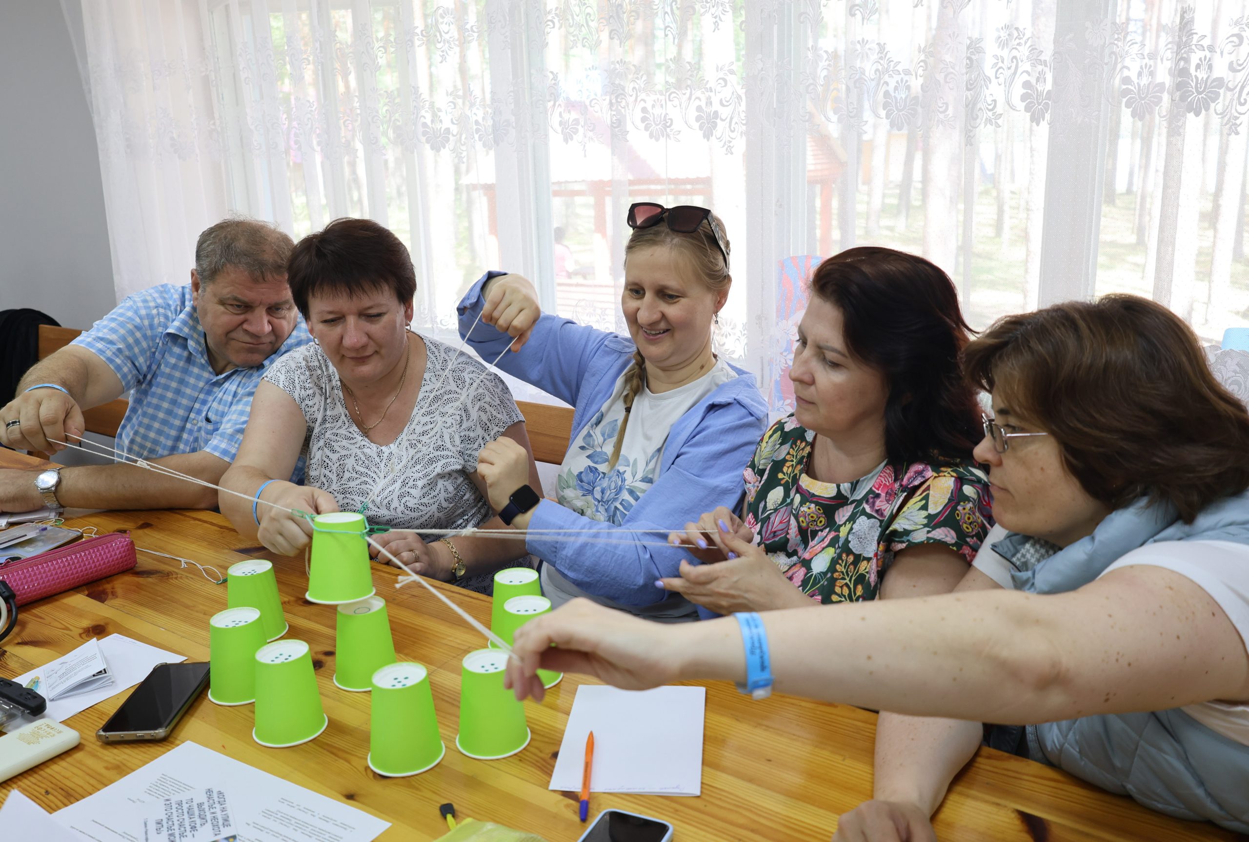 Праекты ў сваёй большасці — камандная работа. Таму настаўнікі працавалі ў камандах: з дапамогай вяровачак разам перамяшчалі папяровыя кубачкі, з выкарыстаннем картак з героямі казкі “Калабок” размяркоўвалі функцыі ў групе. Калі работа была наладжана, паспрабавалі розныя заданні, прыёмы і метады. Будавалі мадэлі форм зямной паверхні і дзякуючы ім змаглі знайсці недакладнасці ў тэкстах падручнікаў. Выкарыстоўвалі метад факальных аб’ектаў, каб стварыць аб’ект з новымі ўласцівасцямі: выбіраўся галоўны (факальны) аб’ект, які патрабаваў удасканалення (у нас была ручка), дабаўлялася некалькі выпадковых аб’ектаў, чые ўласцівасці надалі факальнаму новыя рысы.