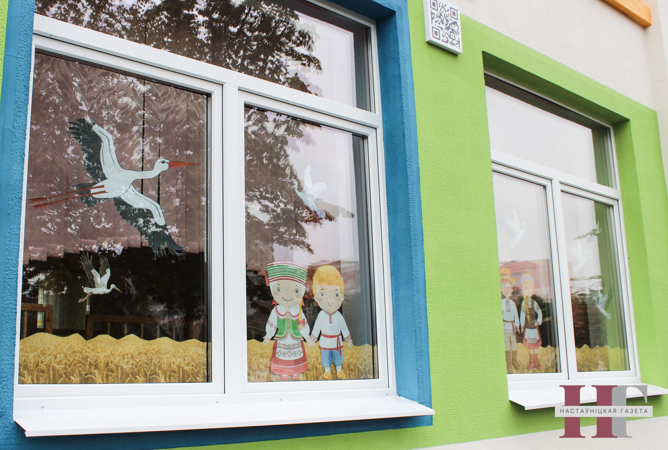 Идея праздничного оформления и правда реализована оригинально. Окна дошкольного учреждения воспринимаются буквально как единое полотно, где есть место и колосистым полям, и юным героям в национальных костюмах, и летящим над ними аистам.