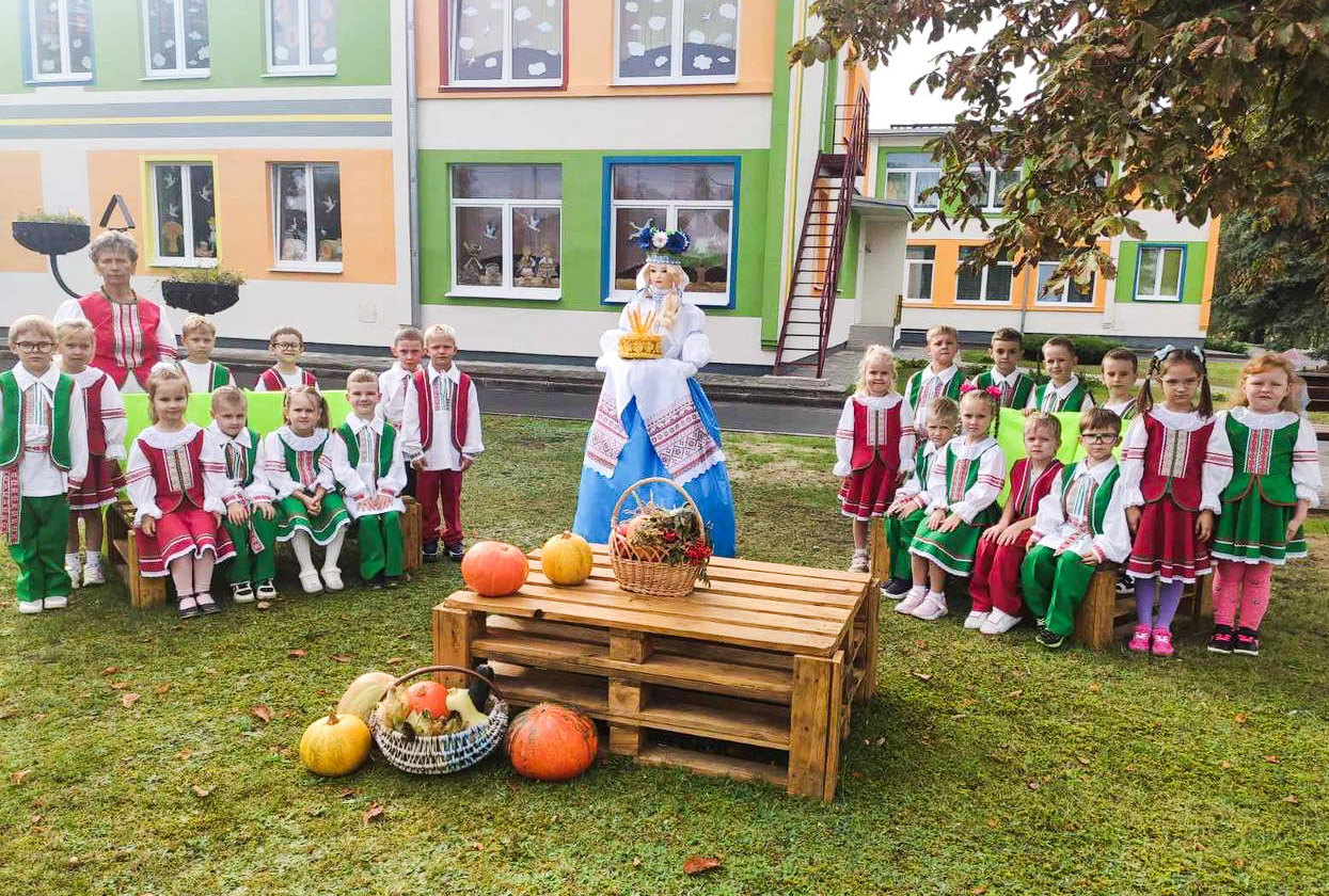 — Совместно с папами и мамами малышей обустроили на территории и тематическую фотозону. Здесь каждое утро с караваем в руках встречает дошколят и школьников фигура Хозяюшки в национальном костюме, а на столе — урожай 2025 года с участков наших педагогов и родителей воспитанников, — продолжила О. Мазец.