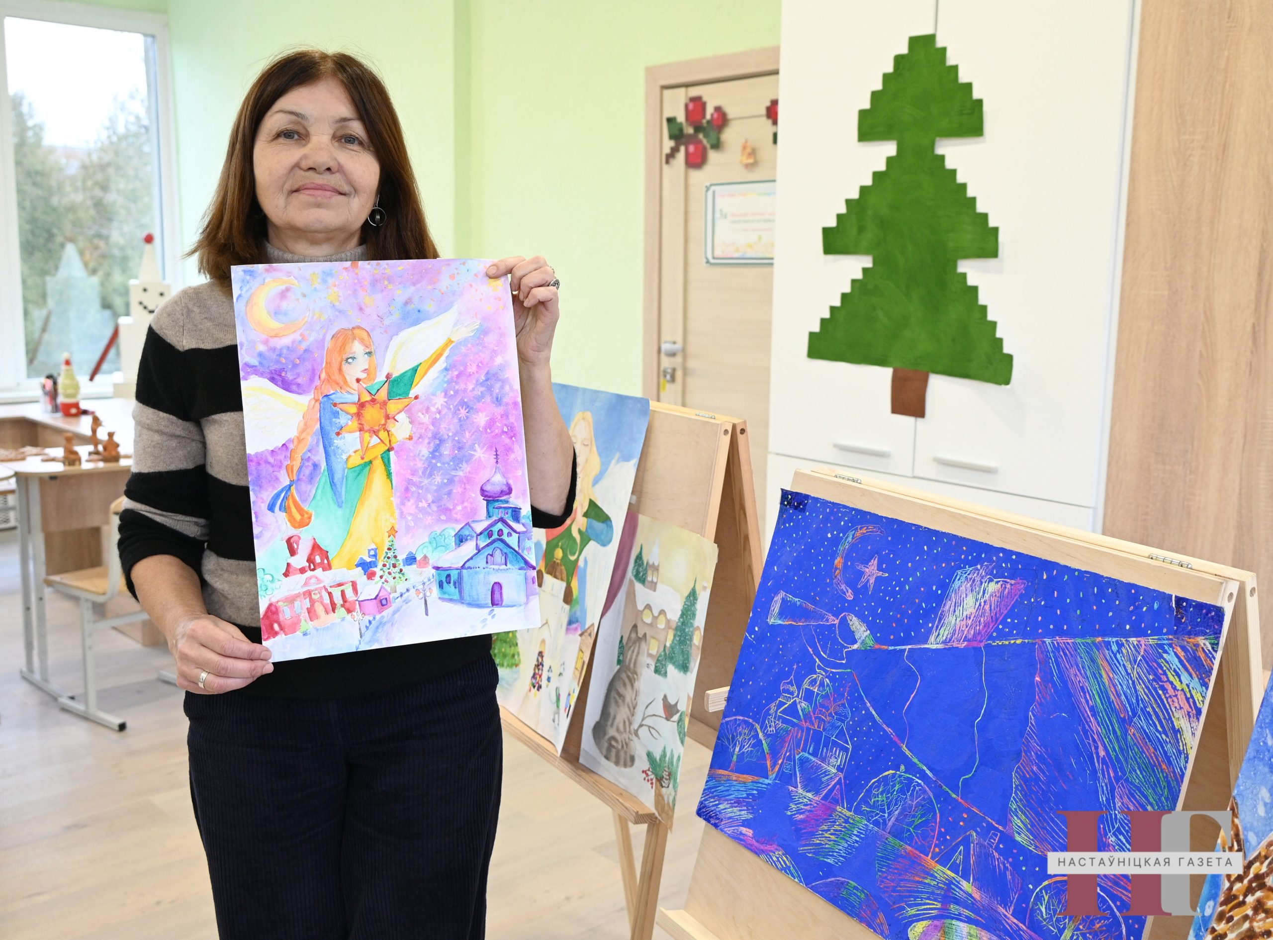 Па яе словах, дзеці вельмі любяць свята Нараджэння Хрыстова. Тэматычная выстава гэта пацвярджае. Вось анёлы нясуць радасную вестку. Побач коцікі любуюцца рознакаляровымі гірляндамі. На суседнім малюнку вераб’і скачуць на снезе каля святочнай ёлкі. Ад гэтых простых вобразаў вее ўтульнасцю, цеплынёй, атмасферай добрага, светлага свята.
