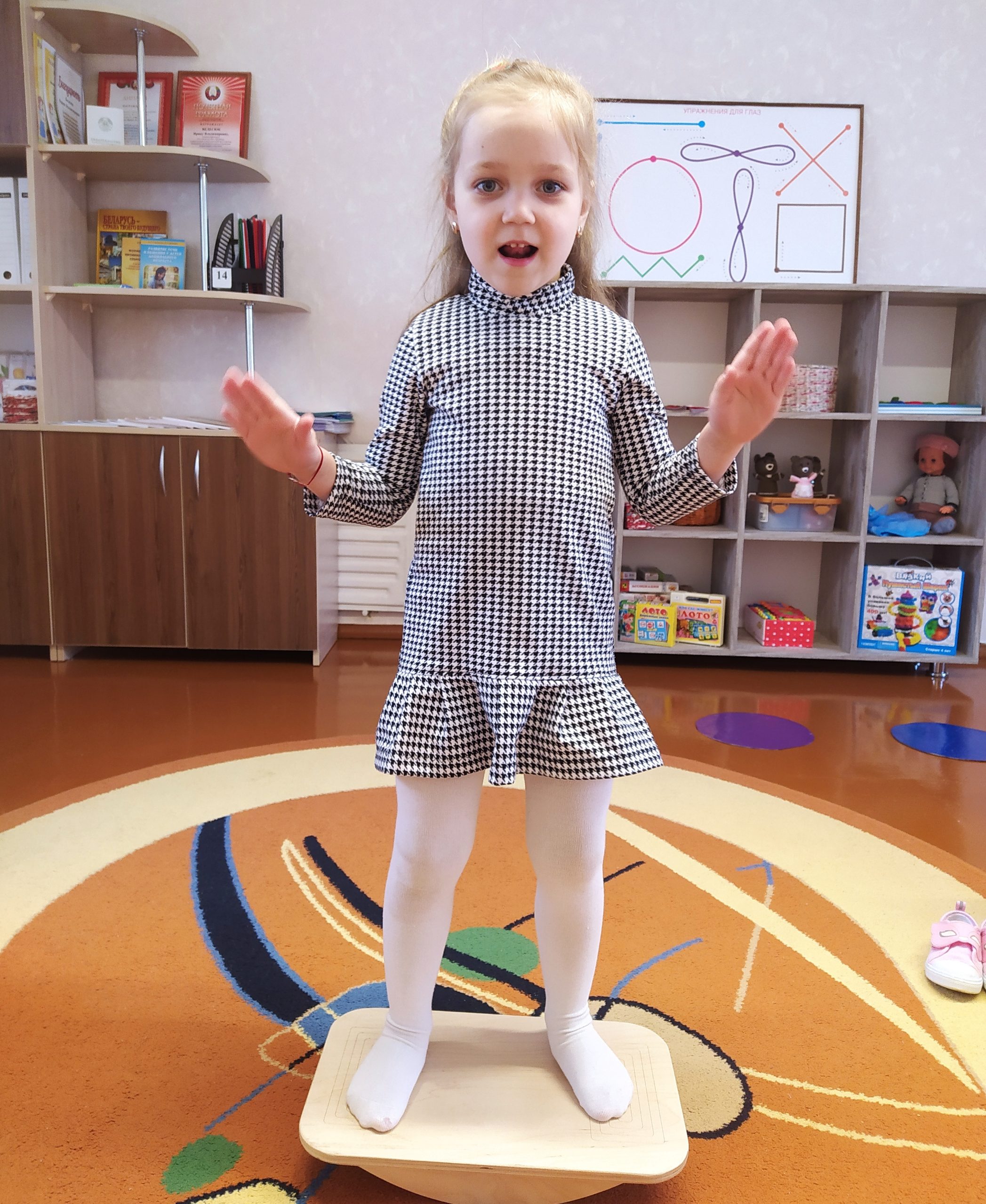 Знаёмячыся з балансірам, дзеці становяцца на балансіровачную дошку і вучацца ўтрымліваць раўнавагу (спачатку з падтрымкай педагога, а пасля без яе). Затым дашкольнікі, стоячы на дошцы, выконваюць класічную артыкуляцыйную гімнастыку. І толькі затым да яе дабаўляюцца кінезіялагічныя практыкаванні.