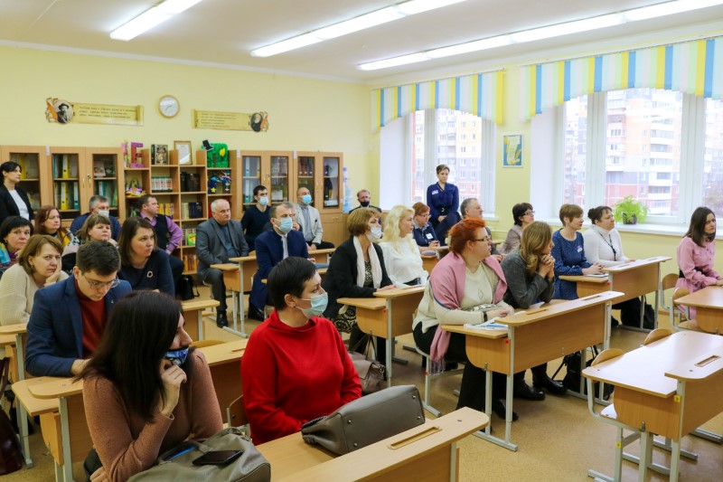 У гімназіі № 7 кіраўнік педагагічнага калектыву Святлана Дарошчанка, настаўніцы рускай мовы і літаратуры азнаёмілі з рэсурсным цэнтрам па гэтым вучэбным прадмеце. Настаўніца вышэйшай кваліфікацыйнай катэгорыі Алена Аляксандрава падзялілася вопытам работы з адоранымі навучэнцамі, падрыхтоўкі да алімпіяд з прымяненнем сучасных сродкаў навучання. Настаўніца першай кваліфікацыйнай катэгорыі Наталля Камароўская прадэманстравала, як выкарыстоўвае IT-тэхналогіі на ўроках у старшых класах, прыцягваючы ўвагу вучняў да вучэбных прадметаў з дапамогай незвычайных заданняў. Асаблівую цікавасць у гасцей выклікала канцэпцыя трансфармацыі і выкарыстання прасторы ўнутры кабінета, які займае рэсурсны цэнтр: замест звыклых шафаў з метадычнымі дапаможнікамі ля задняй сцяны размясціліся зручныя канапкі са столікамі, дзе знаходзяцца раздатачны матэрыял і канверты з індывідуальнымі заданнямі. Тут у адпаведнасці з пастаўленымі вучэбнымі задачамі група навучэнцаў у ходзе заняткаў можа аддзяліцца ад класа і папрацаваць самастойна ці з запрошанымі кансультантамі — у гэтай ролі звычайна выступаюць настаўнікі або старшакласнікі. На сценах — паліцы з кнігамі, лялькамі, што “ажываюць” на ўроках літаратуры. Побач з дошкай усталяваны мультыборд, які актыўна выкарыстоўваецца ў адукацыйным працэсе.