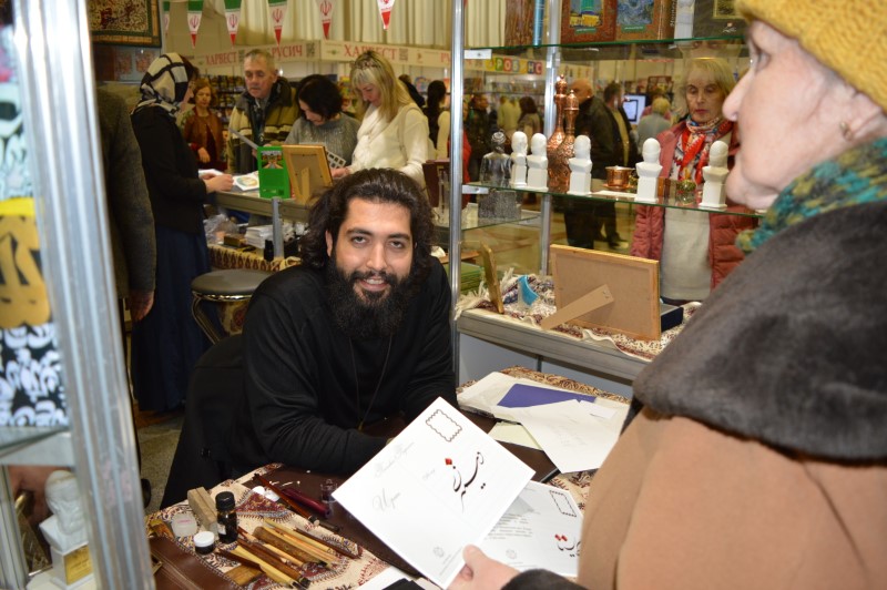 Іду далей. Стэнд Ірана. Ля яго таксама пастаянна была чарга. Мне стала цікава чаму, і, праціснуўшыся бліжэй, я ўбачыла знакамітага мастака, каліграфа з Ірана, майстра Касра Карказі, які ладзіў майстар-клас. “Ён адзін з самых знакамітых іранскіх каліграфаў, які працуе ў розных стылях. У Іране ён прызнаны як “Пясняр пісьма”, які выяўляе музычныя матывы ў каліграфіі. Майстар на англійскай мове падзяліўся тонкасцямі і сакрэтамі авалодвання персідскай каліграфіяй з наведвальнікамі кніжнага форуму, — расказала прадстаўніца стэнда. — Мы прывезлі сюды каля 50 кніг расійскага выдавецтва “Садра” — гэта перакладная літаратура з персідскай мовы на рускую, ёсць і дзіцячая, і мастацкая літаратура, і раманы, і Каран. А таксама мы паказваем багатую іранскую культуру праз розныя прадметы”.