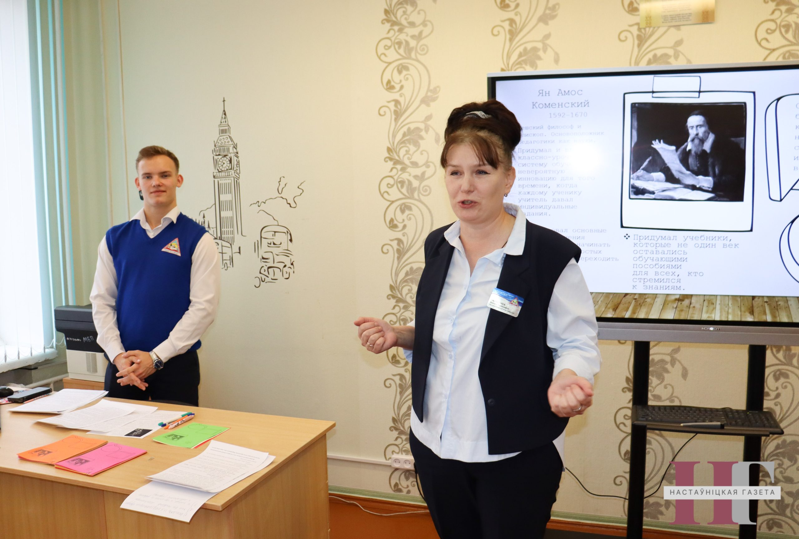 Настаўніца беларускай мовы і літаратуры гімназіі Вольга Тарасенка і адзінаццацікласнік Ягор Смоўж правялі класную гадзіну ў форме інтэрактыўнай размовы пра вялікіх педагогаў Марыю Мантэсоры, Яна Амоса Каменскага і Януша Корчака, які, дарэчы, сцвярджаў, што “дзяцей няма — ёсць людзі, але з іншым маштабам паняццяў…”. І гэта значыць, што педагогіка — навука пра чалавека. Асаблівую ўвагу на занятках удзялілі настаўнікам — героям Вялікай Айчыннай вайны.