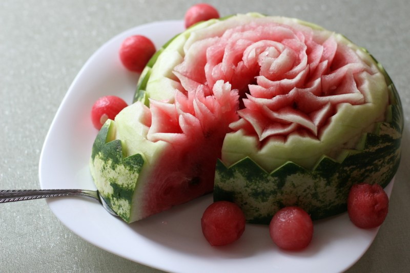 “Усё змянілася, калі я, жывучы часова ў Латвіі, выпадкова ўбачыла відэаролік, дзе навучэнцаў кулінарнага вучылішча вучылі выразаць ружу на кавуне. Я тут жа разрэзала кавун, на яго палавіне паўтарыла звычайным нажом тую ружу і пабегла да сяброўкі пахваліцца. Тады мне здавалася, што я выразала самую дасканалую кветку ў свеце! Так радавалася, што ў мяне атрымалася! Потым адна з сябровак падарыла мне на дзень нараджэння набор нажоў для карвінгу. З таго дня я і захварэла ім па-сапраўднаму. Глядзела відэаролікі, чытала дапаможнікі і выразала, выразала, выразала… Літаральна з усяго, што траплялася мне ў рукі. Я не выбіраю матэрыялы — выразаю на ўсім, што можна рэзаць. Эксперыментавала нават на шакаладзе — і на цэльным кавалку, і нават на шакаладных цукерках”.
