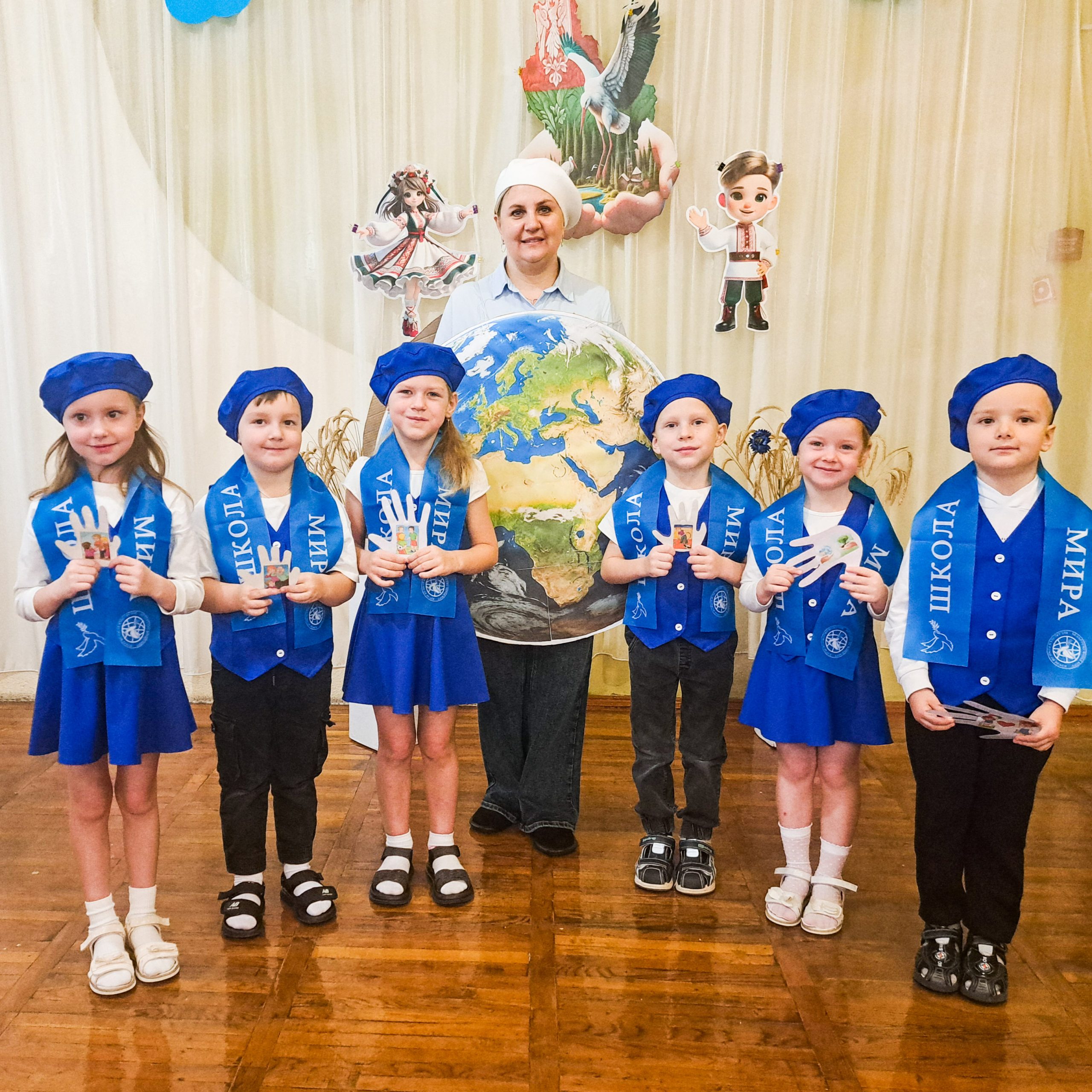 — Наш детский сад — старейшее дошкольное учреждение Столинщины, основанное в первый мирный, послевоенный 1946-й год, — отмечает заведующая Ирина Ярошевич. — На протяжении десятилетий мы храним и передаем воспитанникам главную ценность — ценность мира. Сегодня сад посещают 110 малышей, работают 13 педагогов. Ряды миротворцев пополнили 13 девочек и 7 мальчиков со старшей группы. Теперь на все значимые мероприятия они будут надевать небесного цвета форму — жилеты и береты. Дополнением к ним станут ярко-голубые шарфы с надписью «Школа мира».