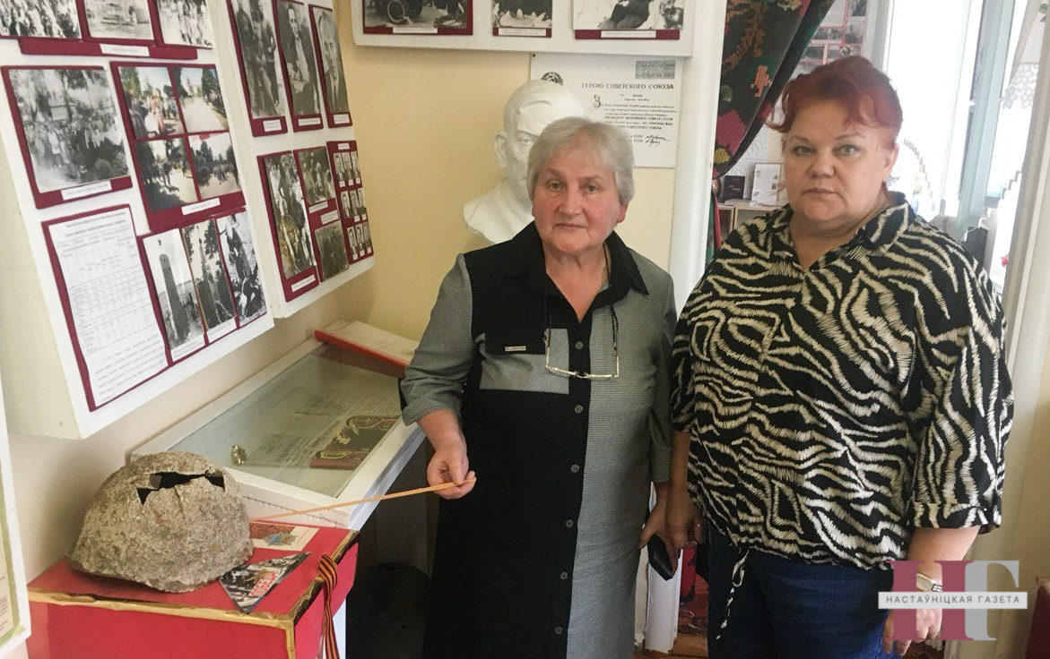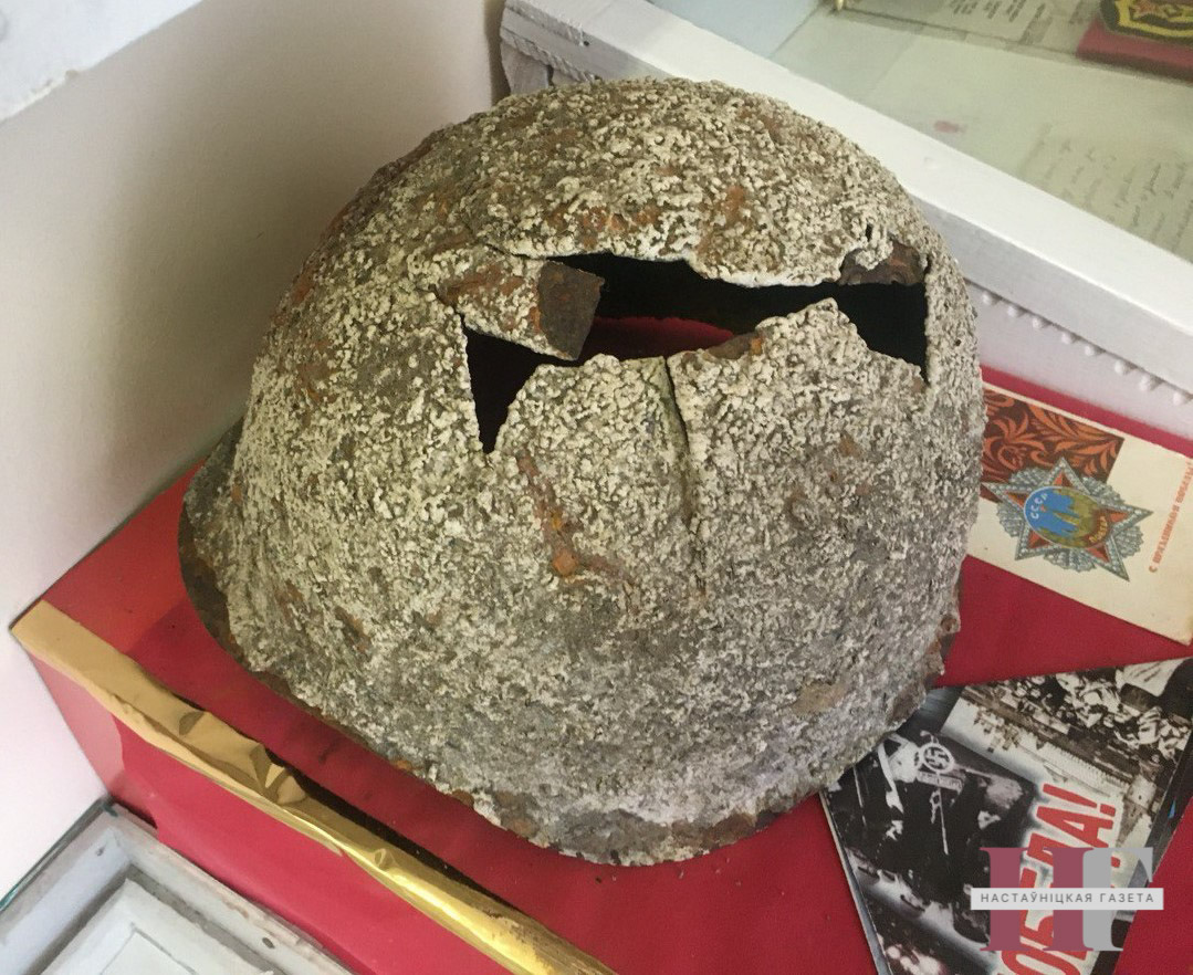 Дырэктар Людміла Аркадзеўна перадала ў музей рэдкую кнігу на роднай мове, выдадзеную… немцамі ў 1942 годзе. І канторскі арыфмометр. А яшчэ — каску савецкага салдата, знойдзеную пры рэчцы Уша, на месцы былых баёў. Каска ржавая, прабітая, разбураецца. Тым і каштоўная. Гэта і сімвал подзвігу народа, і незваротнасці ракі часу, і добры напамін школьным края­знаўцам: трэба паспець! Трэба зберагчы тое, што знікае, перакінуць нябачны масток з мінулага праз наш час — у будучыню. Бо непарыўнасць падзей менавіта памяццю нашай змацавана.