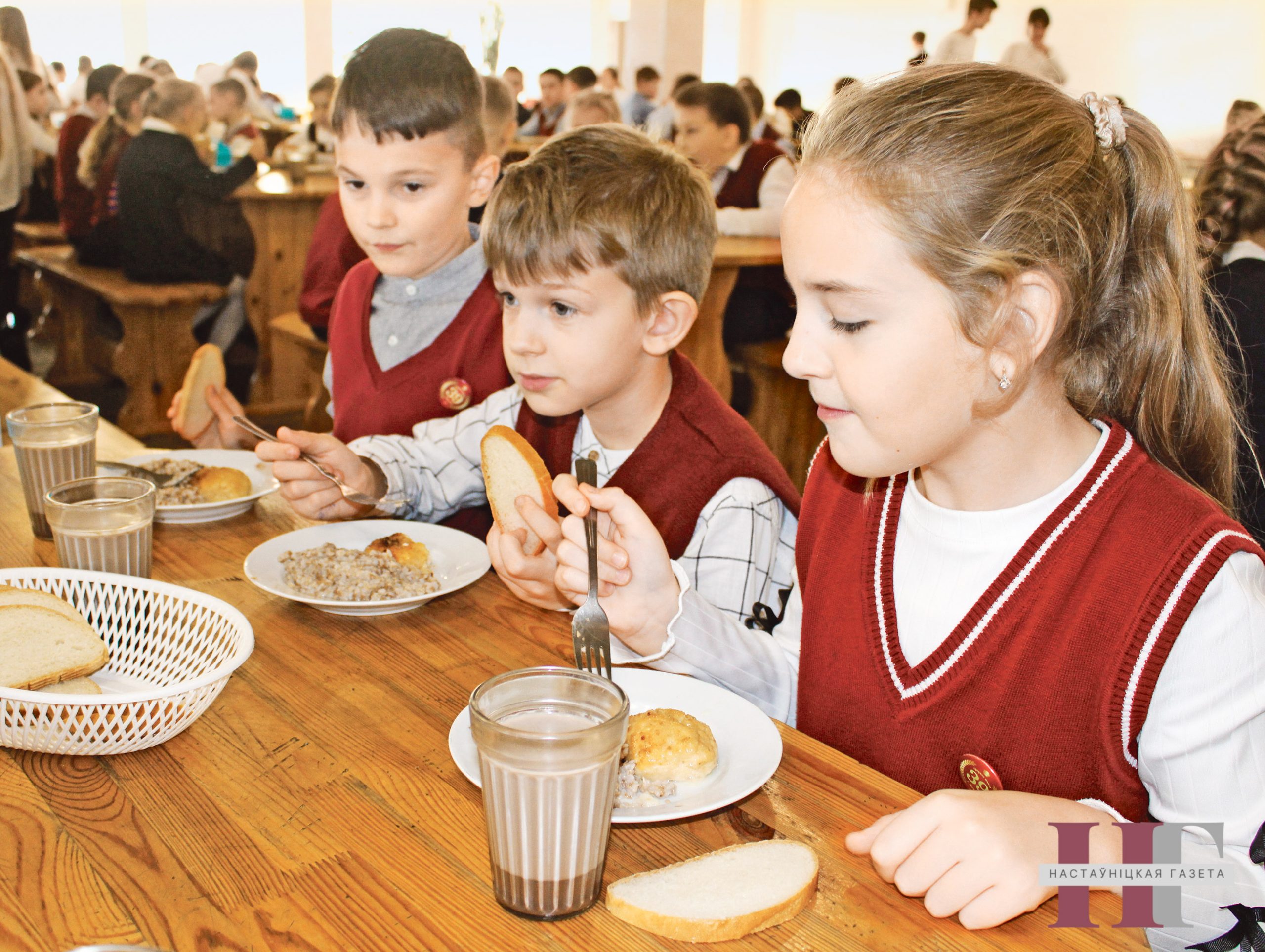 Гутарку з кіраўніцтвам установы адукацыі перарывае званок з урока. На гадзінніку 10.45 — у гэты час у сталовую шумным гуртам накіроўваюцца вучні 3—4 класаў. Тут для іх ужо накрыты сталы са смачным снеданнем. У меню грэцкая каша, курыны біточак з сырам, хлеб пшанічны і какава з малаком. Ядуць дзеці з апетытам. За сталамі пануе ажыўленне, і ў літаральным сэнсе звіняць прыборы.