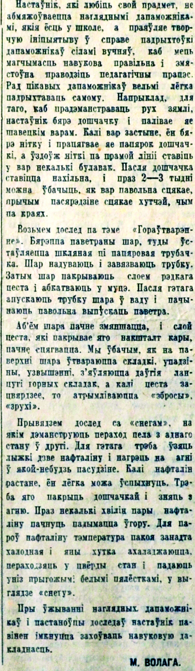 Далей у артыкуле прыводзяцца довады на карысць метадычна правільнага выкарыстання наглядных дапаможнікаў. Аўтар М.Волага адзначыў, што вынікі экзаменаў па геаграфіі паказалі: частка вучняў прадэманстравала высокі ўзровень ведаў, бо пры іх навучанні “шырока прымяняліся наглядныя дапаможнікі, практыкаваліся экскурсіі і доследы”, а другая частка — “слаба засвоіла праграмны матэрыял, дрэнна ведае карту, не ўмее карыстацца компасам, не ўмее звязна і пісьменна перадаваць свае веды” (у прынцыпе, такое ж дзяленне ёсць і цяпер).