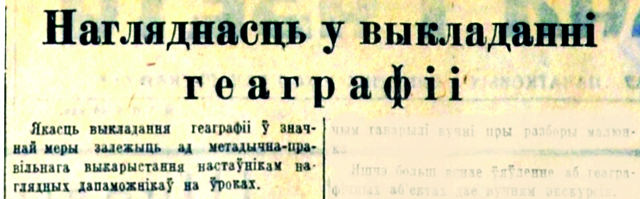 “Нагляднасць у выкладанні геаграфіі” — прачытала загаловак на старонцы “Настаўніцкай газеты” за 8 жніўня 1946 года і падумала, што праблемы нагляднасці — “класіка жанру”, бо заўсёды нечага не хапае. Увесь час з’яўляюцца новыя метадычныя магчымасці і прыстасаванні. Час не стаіць на месцы, таму стала вельмі цікава параўнаць, што ж хвалявала метадыстаў у далёкім 1946 годзе і што мы маем на сённяшні дзень.