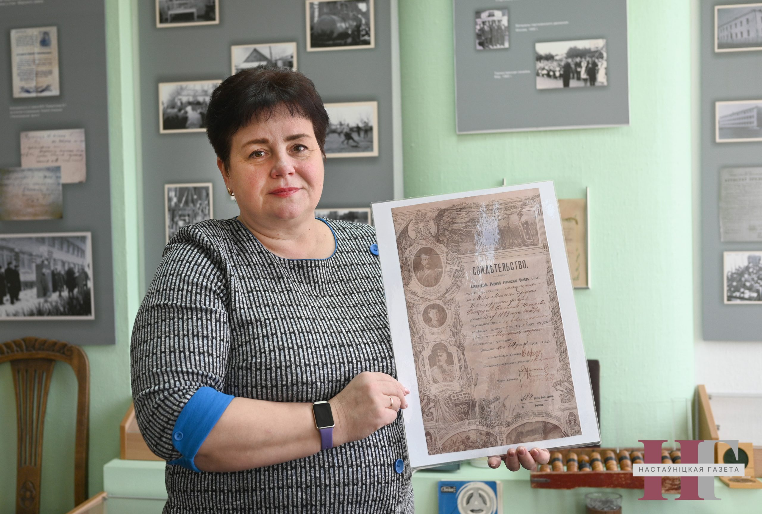 Дырэктар сярэдняй школы Міра імя Г.І.Сташэўскай Т.І.Шаплыка з пасведчаннем свайго дзядулі аб заканчэнні Мірскага народнага вучылішча