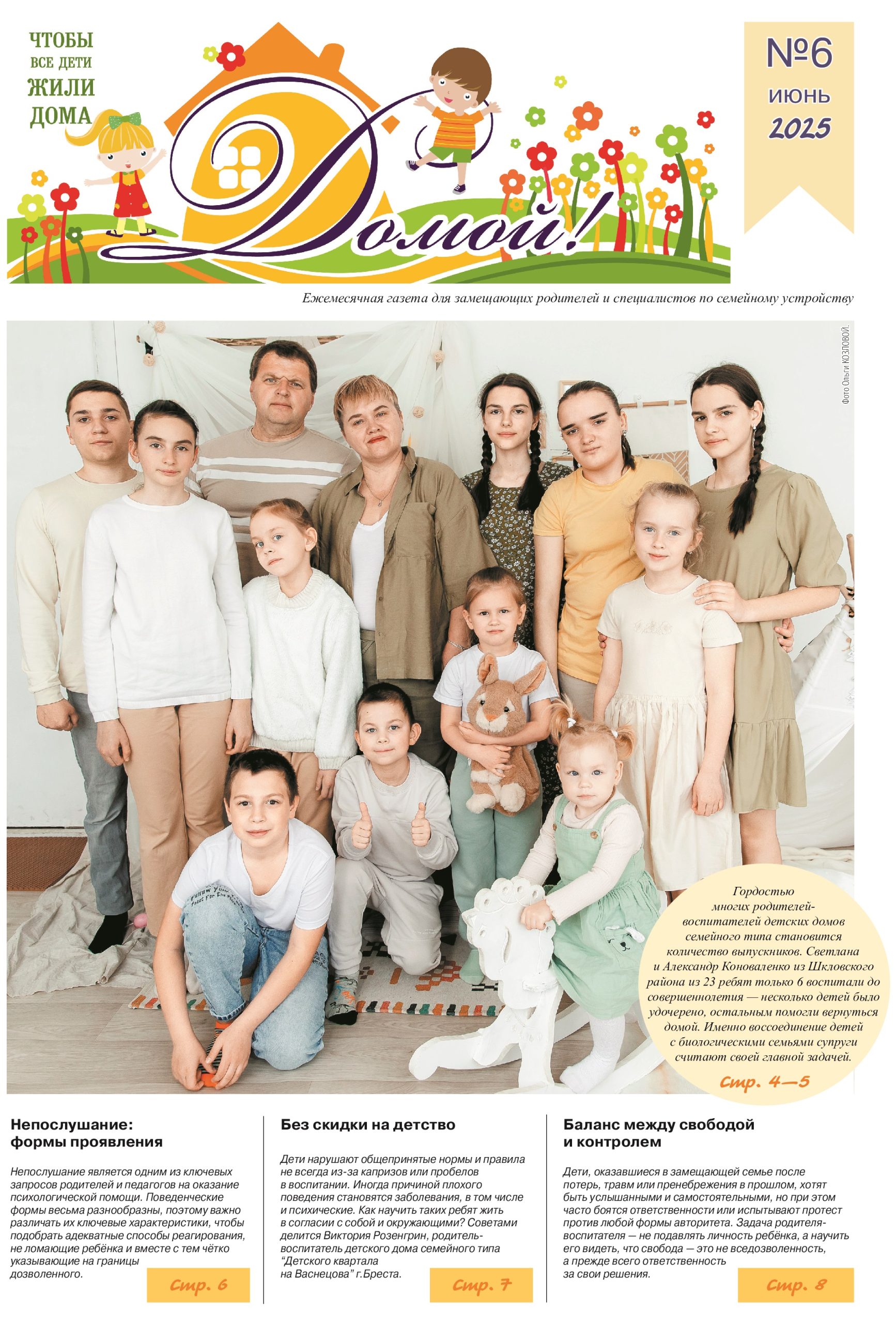 Героями июньского номера стали и победители могилевского областного конкурса замещающих родителей “Сердце отдаю детям”. Это приемная семья Галины Говорковой из Круглянского района, которая 20 лет жизни посвятила воспитанию детей, и детский дом семейного типа Светланы и Александра Коноваленко из Шкловского района. Особенность подхода к работе супругов Коноваленко в том, что они с первого дня принятия в семью ребенка делают все возможное, чтобы тот как можно быстрее вернулся в биологическую семью. В итоге из 23 воспитанников только 6 стали их выпускниками — остальные вернулись к родным мамам и папам. Как Светлана и Александр Коноваленко помогают воспитанникам и их биологическим родителям не потерять друг друга и какую роль здесь играет кулинария, читайте в материале “Душа семьи живет на кухне”.