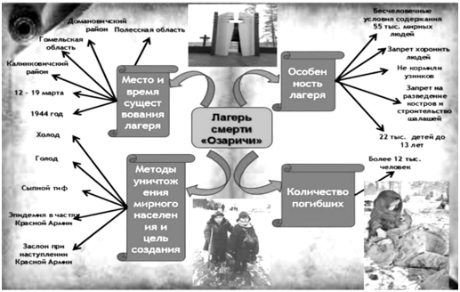 С помощью ментальной карты ученики повторяют материал, работая в группах, затем организуются выступления нескольких человек. Для закрепления знаний учитель предлагает заполнить ментальную карту с недостающими звеньями, которая вывешивается на доске. Затем ученики рассматривают фотографии, сделанные в 1944 году в лагере смерти «Озаричи», и получают задание перевести визуальный образ в вербальный, продолжив и записав следующие фразы: 1) «На фотографии я вижу…»; 2) «Я слышу…»; 3) «Я чувствую запах…»; 4) «Я думаю, что после произойдет…»; 5) «Мое отношение к данным событиям следующее…».