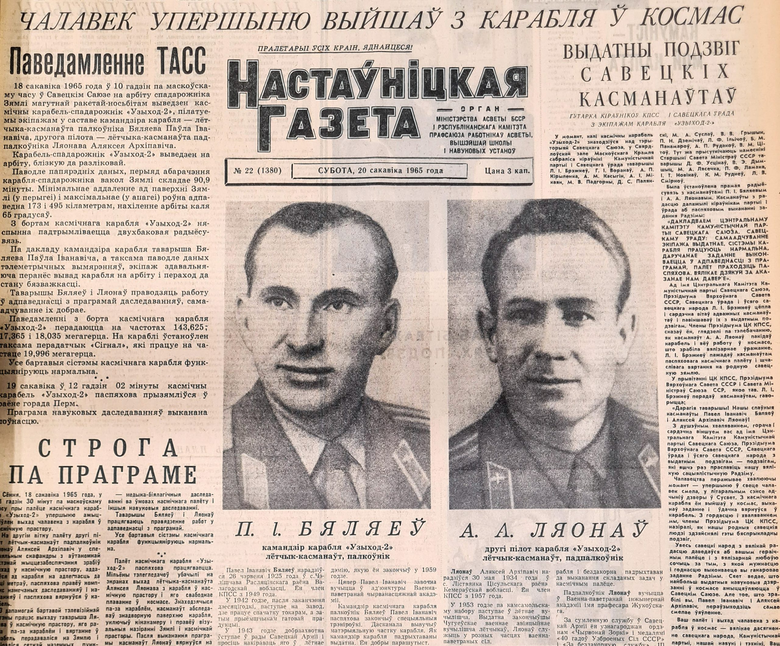 Два дзесяцігоддзі мінула пасля Вялікай Айчыннай. Ваенныя раны паступова загойваюцца, краіна з аптымізмам глядзіць у будучыню. Хуткімі тэмпамі ўзводзіцца жыллё, заводы і фабрыкі павялічваюць аб’ёмы вытворчасці, пачалося асваенне космасу… Усё гэта адлюстроўваецца і на старонках “Настаўніцкай”. Так, першую паласу № 22 за 20 сакавіка ўпрыгожылі партрэты лётчыкаў-касманаўтаў Паўла Бяляева і Аляксея Лявонава. “Слава вам, героі! Чалавек упершыню выйшаў з карабля ў космас”, — чытаем уверсе вялізнымі літарамі.