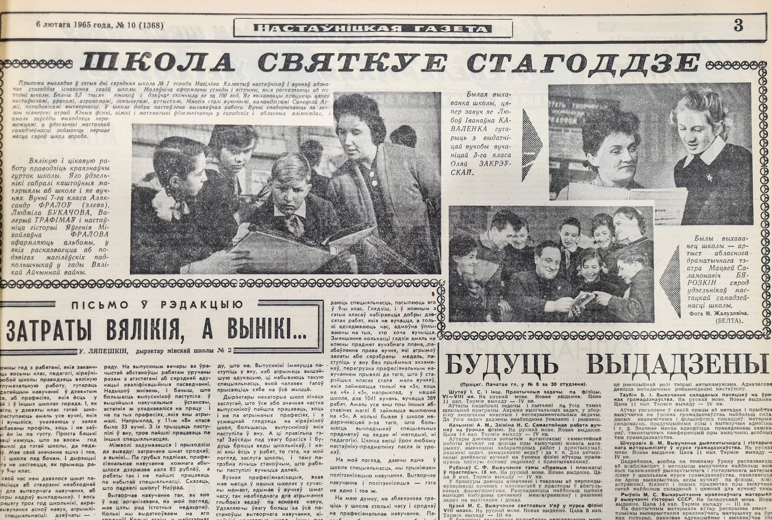 Газета асвятляла не толькі будаўніцтва школ, але і юбілеі. Адной з іх (сярэдняй школе № 1 Магілёва) у 1965-м споўнілася 100 гадоў. Пра гэта яркі фотарэпартаж уверсе трэцяй паласы № 10 за 6 лютага.