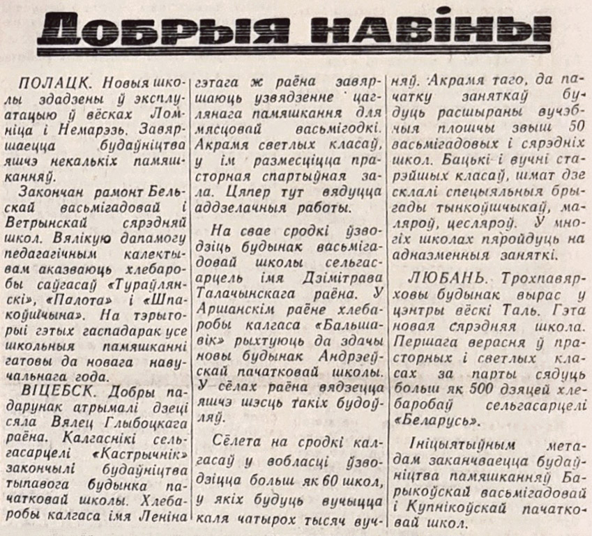 1960-я гады — перыяд актыўнага ўзвядзення не толькі жылля (так званых хрушчовак і брэжневак), але і сацыяльных аб’ектаў, у першую чаргу дзіцячых садоў і школ. Практычна ў кожным нумары 1965 года ў рубрыцы “Добрыя навіны” знаходзім адпаведныя паведамленні.