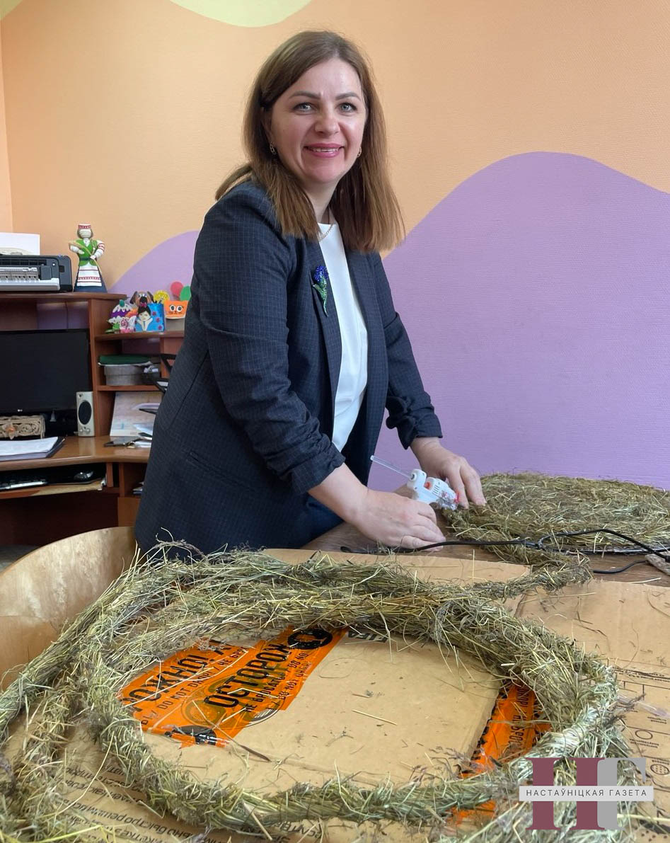 «Гэта мы рыхтуем работы на конкурс «Светлае свята Уваскрэсення Хрыстова», — паказвае на курачку і яе будучае гняздо Ірына Мінько. — Курачка, як бачыце, пры парадзе. Ёй зробім седала — так у вёсках называюць курынае гняздо. Праца вялікая, робім усё талакой. Вось гэтае сена скруцілі з дзецьмі, я крыху дапамагаю там, дзе пакуль маім выхаванцам вопыту не хапае».