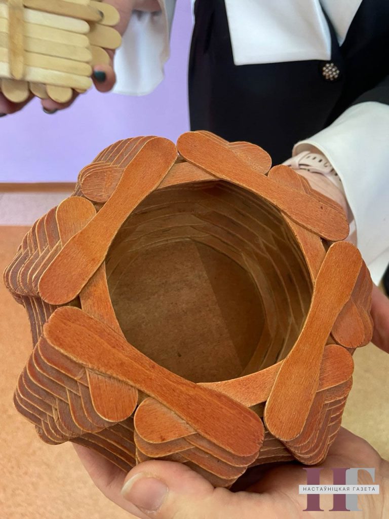 Тым часам дырэктар на палічках знайшла «палачкавую шкатулку». Арыгінальна! І вечка падагнана, і ўнутр можна заглянуць, падзівіцца, як там усё складзена. Як такую тэхніку назваць?.. А дзе столькі палачак набраць? Усміхаецца майстрыха: «Усім у сям’і была каманда: не выкідваць, збіраць! А сям’я марожанае любіць: два хлопчыкі ў нас і дзяўчынка: Аляксей, Андрэй і Алена. Яны, дарэчы, усе пры справе, праз маю творчую лабараторыю прайшлі. З хлопчыкамі вельмі шмат ляпілі з пластыліну, можна сказаць, куплялі тонамі. Ленка са мной рукадзельнічае, работы і на конкурсы робім».