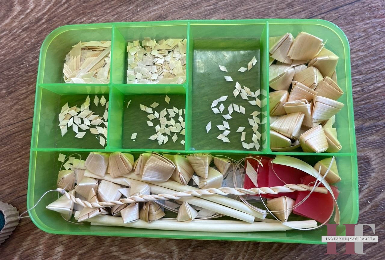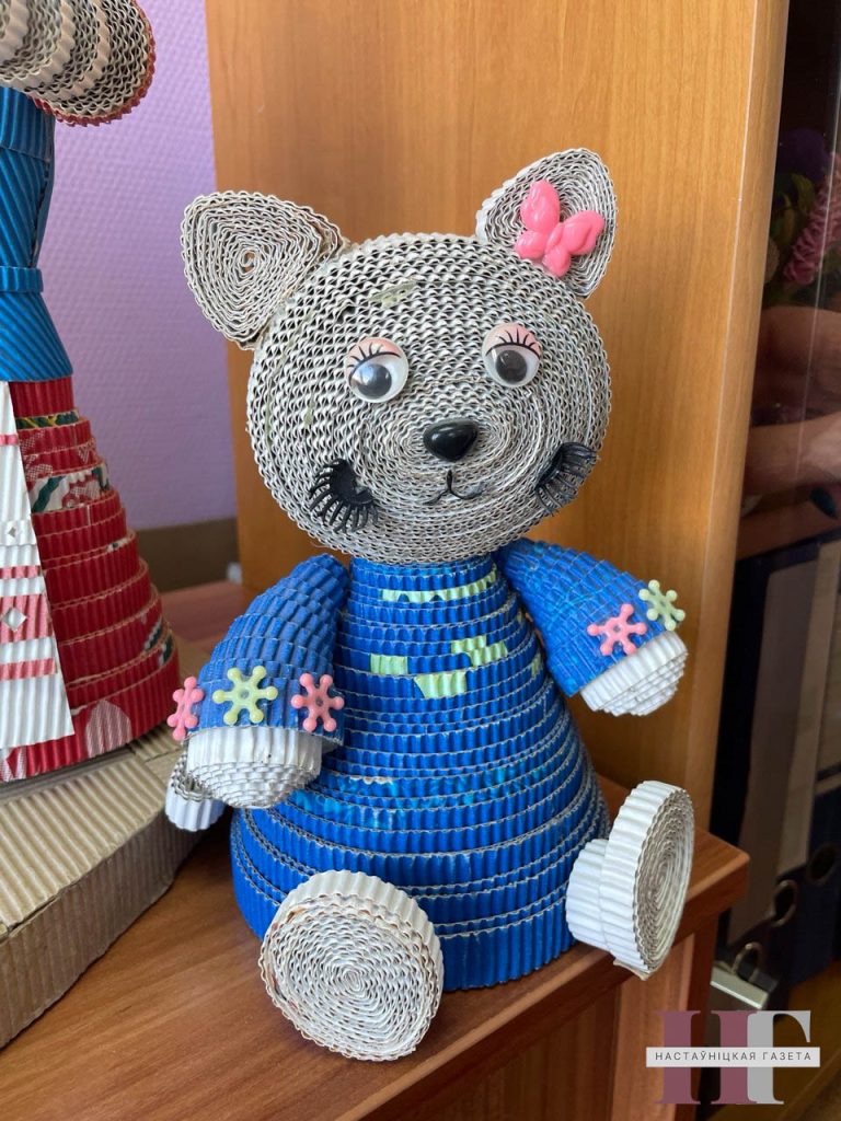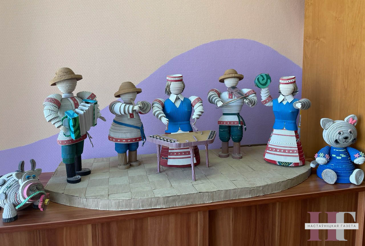 «Мы вучымся рабіць інкрустацыі, аплікацыі, а пляценне з саломкі пакуль яшчэ не асвоілі, але да таго падступаемся, гаворыць Ірына Мікалаеўна. — Што дзе ўбачу цікавае — тое асвойваю і дзетак навучаю. Тут заўжды кіпіць праца: хто з клеем, хто з разцом, хто з нажнічкамі… Прычым штораз апрабоўваем новыя ідэі. Цяпер шмат чаго робім з гафрыраванага кардону. Гэта звычайна ўпакоўка для кветак, яго нам аддаюць гандляры, а мы знаходзім яму новае прымяненне».