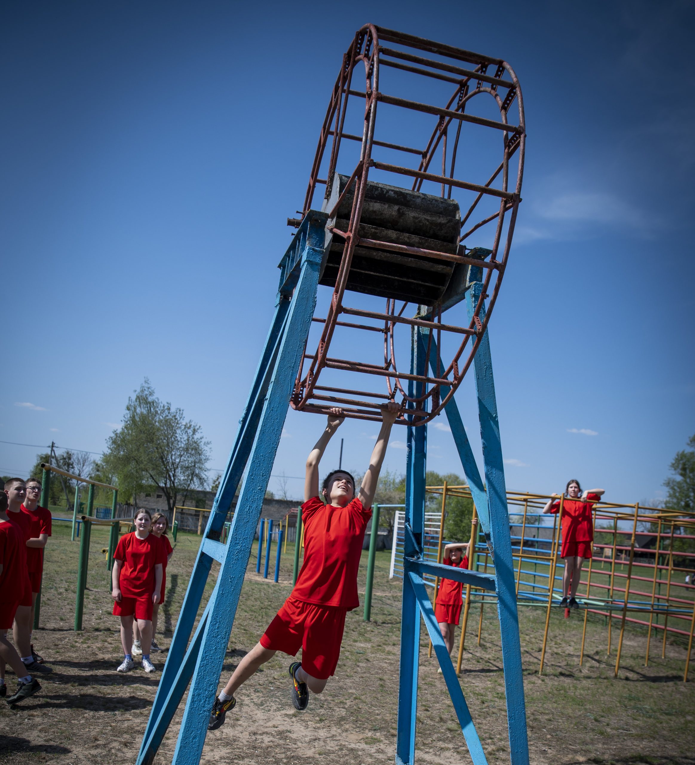 Мальчишки определенно сильнее, но и девчонки стараются не отставать, хоть и подтягиваются при помощи учителя.