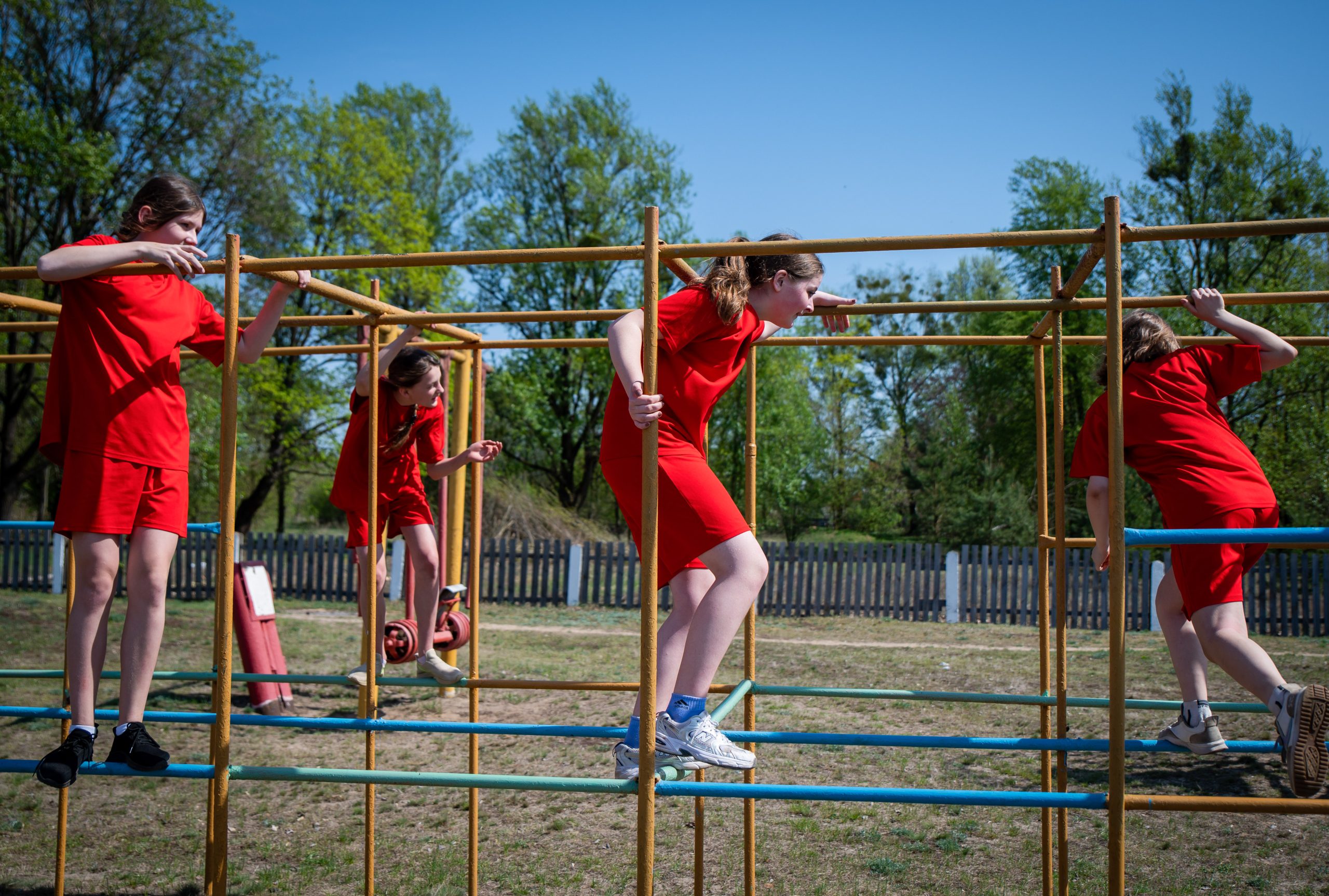 Мальчишки определенно сильнее, но и девчонки стараются не отставать, хоть и подтягиваются при помощи учителя.