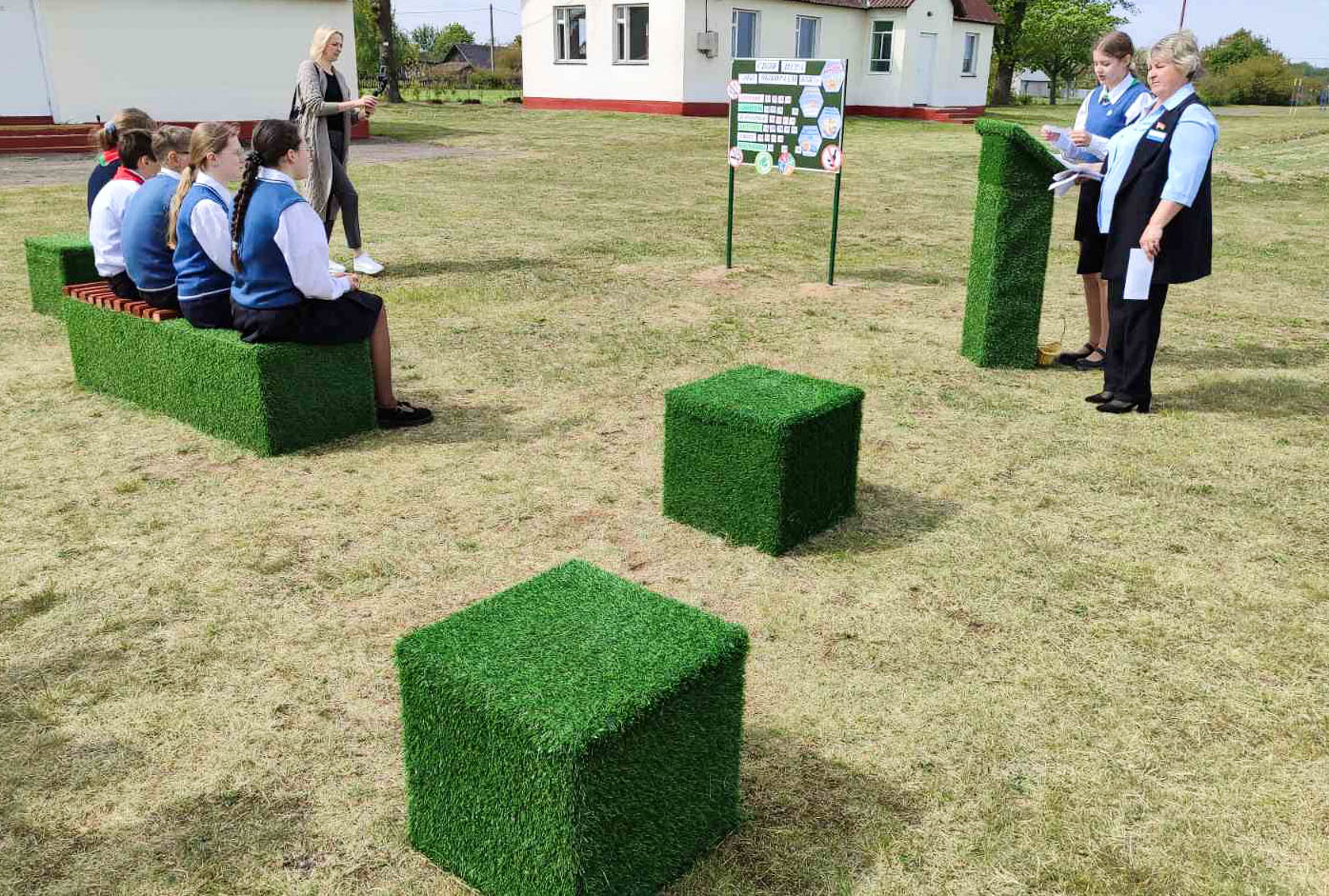О том, что формирование культуры здорового образа жизни у подрастающего поколения — ведущее направление работы учебного заведения, можно понять уже на пришкольной территории: одним из элементов ее благоустройства в этом году стал арт-объект в виде объемных букв ЗОЖ. Появился неподалеку и необычный «зеленый класс» — тематически оформленные скамейки и кафедра для педагога. В теплую погоду здесь можно проводить уроки и воспитательные мероприятия, а в свободное время дети отдыхают.