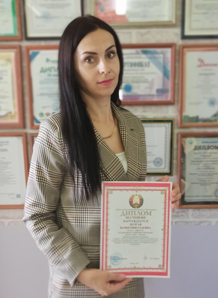 Ю.Доўгая прымае ўдзел у міжнародных навукова-практычных канферэнцыях, з’яўляецца пераможцай раённага конкурсу “Лэпбук — інтэрактыўны сродак павышэння ўзроўню засваення матэрыялу дзецьмі з асаблівасцямі псіхафізічнага развіцця”, адзначана дыпломам І ступені на фестывалі “Педагагічныя чытанні — 2021” у намінацыі “Дыстанцыйныя формы работы з бацькамі, якія выхоўваюць дзяцей з асаблівасцямі псіхафізічнага развіцця”.