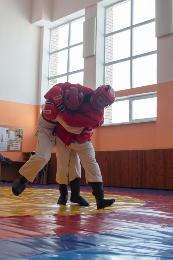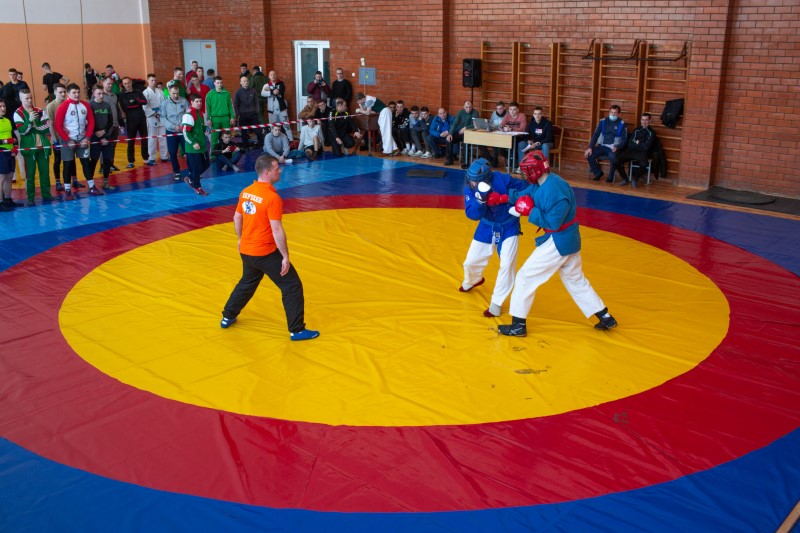 Усе схваткі ў рамках спартакіяды праходзілі ў спартыўна-аздраўленчым цэнтры БДУІР. У якую залу ісці, разумееш адразу: адтуль даносяцца дзясяткі мужчынскіх галасоў. Заходзіш і перад табой — вялікае татамі. На адной частцы ідуць баі, на другой — размінка, падрыхтоўка, апошняя настройка. Дыван акружаюць невялікія сцежкі падлогі, застаўленыя розным абуткам. Зайсці на жоўта-чырвона-сіняе поле можна толькі ў шкарпэтках ці басанож. Каля адной сцяны — некалькі лавак для балельшчыкаў, але гэтага не хапае. Асабліва калі, здаецца, цэлы ўзвод курсантаў пасля пары прыходзіць паглядзець на баі. Сярод гледачоў ёсць і некалькі дзяўчат. Дзве з іх — на працы (медыцынскія супрацоўніцы, якія з цікавасцю здымаюць на відэа чарговы баявы прыём), астатнія, напэўна, прыйшлі падтрымаць любімых.