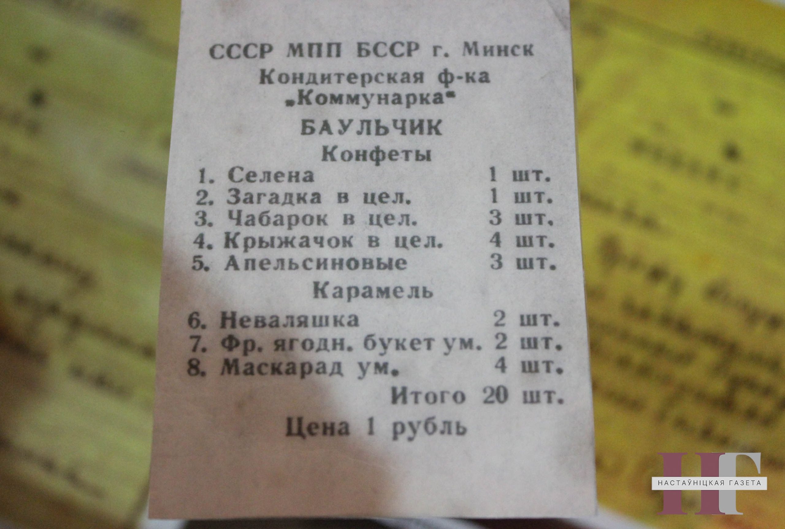 Цікава, што незвычайны экспанат педагог адшукаў у Гомелі ў аднаго з аматараў падобных адсылак да мінулага. Скрынка для цукерак з сініцамі з беларускамоўным варыянтам віншавання “З Новым годам!” да Гродна дабіралася поштай. Яна захоўвала ў сабе яшчэ адно цікавае прывітанне з мінулага — лісток-укладыш са спісам цукерак. Згодна з ім, кожны школьнік краіны ў 80-я атрымліваў 20 цукерак сталічнай кандытарскай фабрыкі “Камунарка” коштам у адзін рубель.