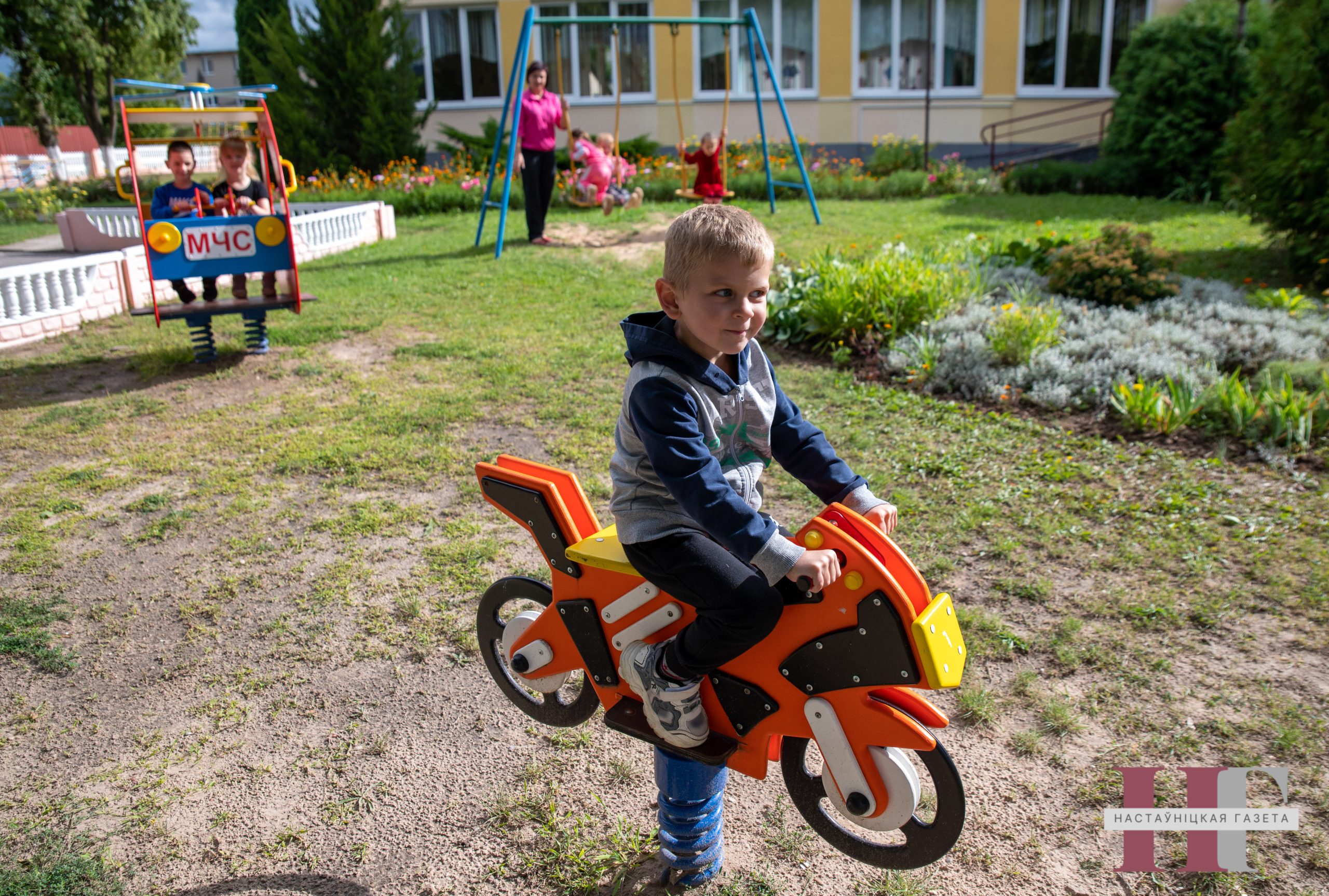 — Недалёка ад гульнявой знаходзіцца спартыўная пляцоўка, — працягвае расказваць Ірына Пальяноўская. — Абсталяванне на ёй размешчана так, каб большая частка пляцоўкі выкарыстоўвалася для правядзення рухавых і спартыўных гульняў, фізкультурных свят і для арганізацыі вольнага часу.