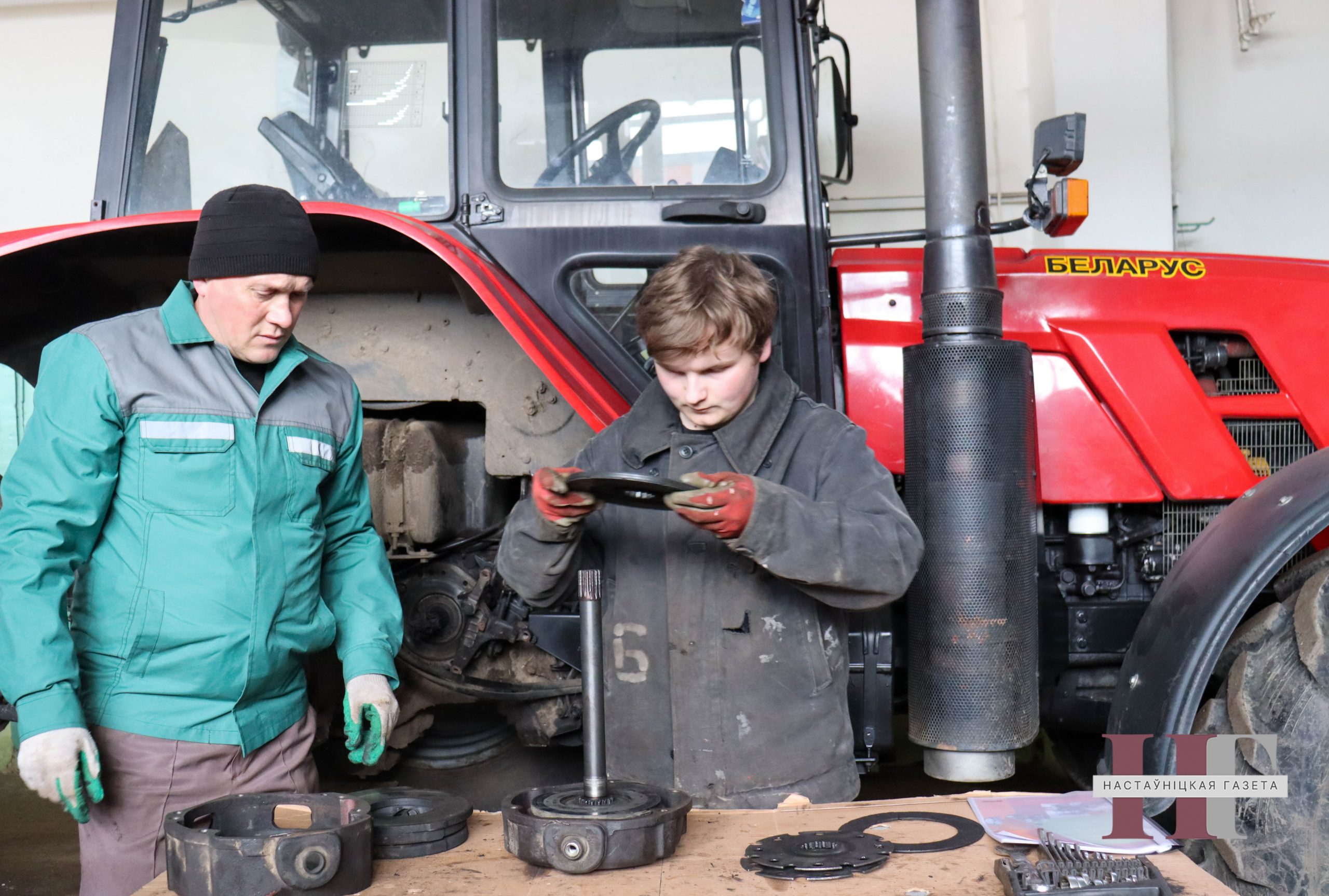 — Калі на 1 курсе будучыя трактарысты асвойваюць асновы язды на сельгастэхніцы на трактарадроме, то на 2 курсе, калі трэба вывучаць падрыхтоўку машынатрактарных агрэгатаў, спачатку практыкуюцца ў слясарнай справе ў майстэрнях, рамантуючы тэхніку, а вясной выязджаюць у поле пад наглядам майстра. Прымаючы актыўны ўдзел у палявых работах, юныя аграрыі ўносяць арганіку, аруць зямлю, сеюць збожжавыя, — апісвае Міхаіл Яўгенавіч, як хлопцы асвойваюць аграрную навуку не на камп’ютарах і трэнажорах, а ў рэжыме рэальнага часу падчас працы ў полі. — Штогод пад азімае трыцікале — пшанічна-жытні гібрыд — адводзіцца каля 100 га. Яшчэ каля 70 га ў маі, калі адступілі замаразкі, засейваюцца кукурузай і пшаніцай. Травой засейваюцца пашы для трох соцень галоў буйной рагатай жывёлы. У пачатку лета актыўна вядзецца нарыхтоўка корму для рагатага пагалоўя: закладваецца на захоўванне 200 тон сіласу і прыкладна 300—400 тон сенажу. У ліпені да выхаду на палі ўжо гатовы збожжаўборачны камбайн. Збожжа ўбіраецца, сушыцца ў нашым мабільным зернесушыльным комплексе і складуецца. Сабраны ўраджай ідзе на продаж, а за атрыманыя грошы закупляецца камбікорм для статка. Увосень трактар з плугамі зноў працуе ў полі, пераворваючы зямлю.