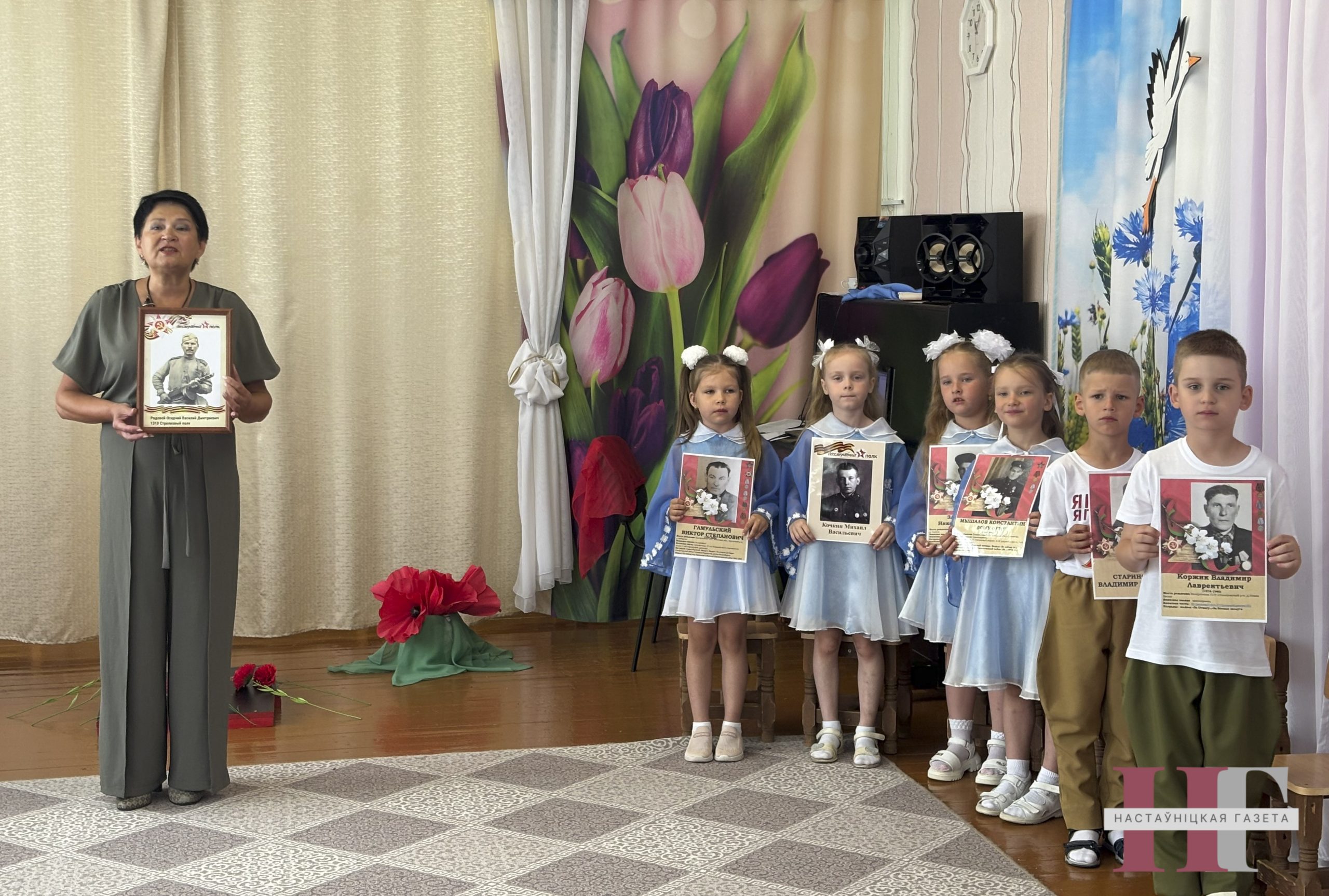 На аснове фактаў аб франтавых і працоўных подзвігах удзель­нікаў Вялікай Айчыннай вайны — родных выхаванцаў і педагогаў — рэалізаваны праект “Мой герой” да 80-годдзя Перамогі. Вынік такой работы — моц­ны эмацыянальны водгук у дзяцей. Выхаванцы прадставілі сваё бачанне ваеннага мінулага ў літаратурна-музычнай кампазіцыі “Дзеці вайны”. Скажу шчыра: гэта было кранальна да слёз. Напрыканцы сустрэчы я спытала ў малышоў, як яны разумеюць слова “Радзіма” і хто такі патрыёт. Яны атаясамліваюць Радзіму са сваім домам, дзіцячым садам, мамай, татам і нават кветкамі, птушкамі, лесам і рэчкай. Яны дакладна ведаюць, што наша Радзіма — Беларусь, і з гордасцю адзначаюць, што чытаюць беларускія вершы і спяваюць беларускія песні. Дзеці таксама ведаюць, хто такі патрыёт.