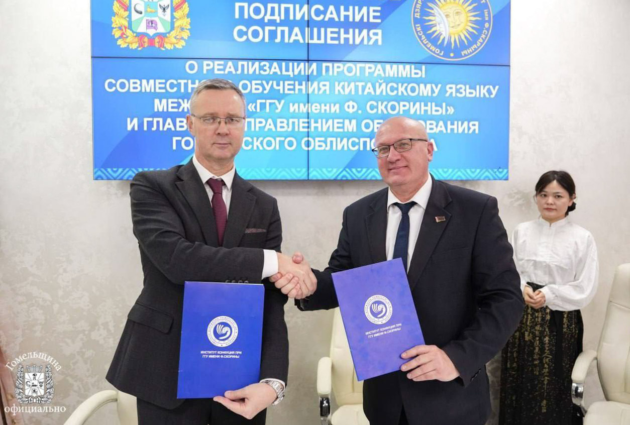 Свои подписи под документом о реализации программы совместного обучения китайскому языку поставили начальник главного управления образования Гомельского облисполкома Руслан Смирнов и ректор ГГУ имени Ф. Скорины Сергей Хахомов.