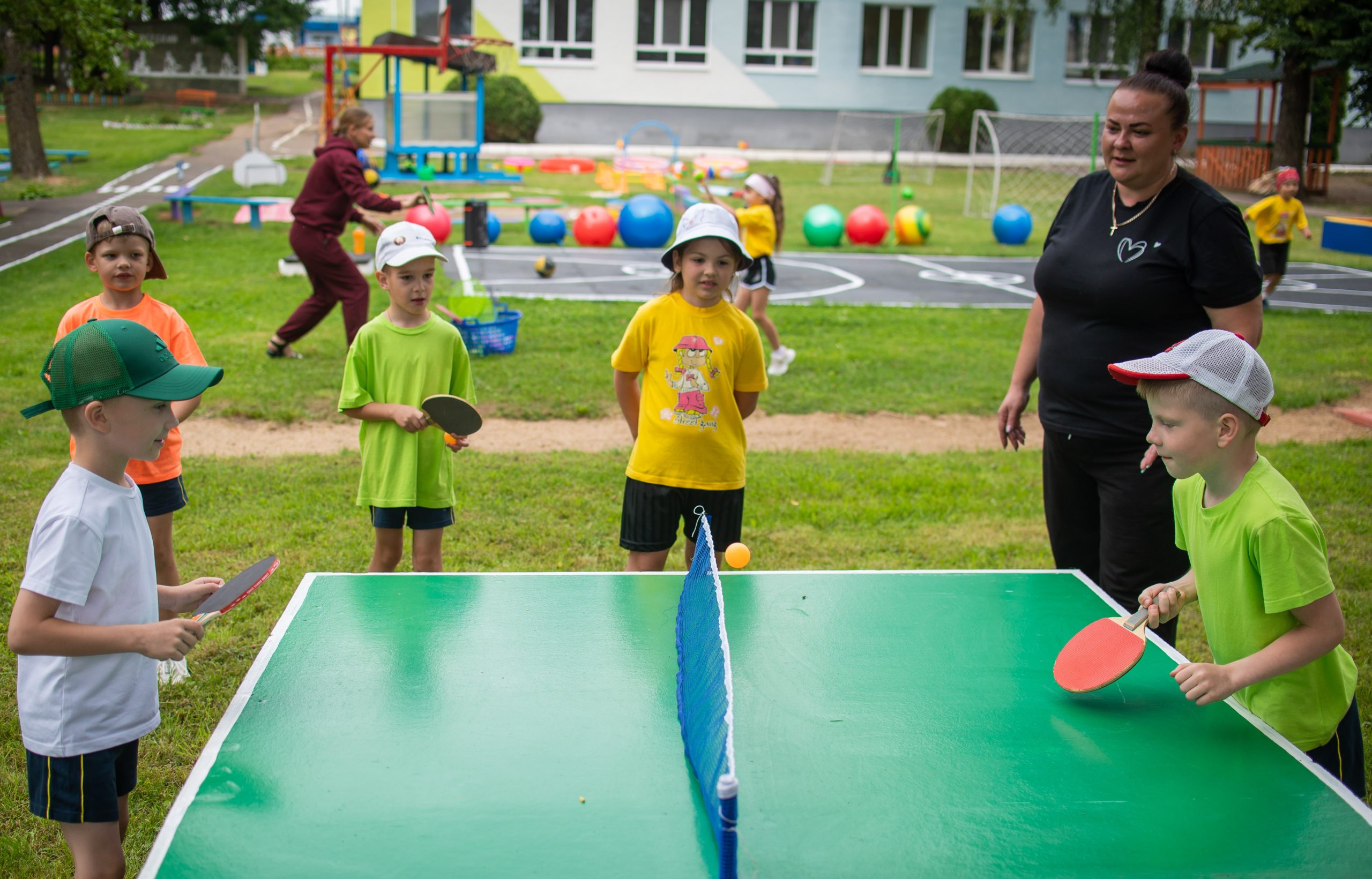 — На станции «Мирная» наши маленькие воспитанники получают первые навыки игры в настольный теннис, — знакомит с очередной локацией преподаватель. — Настольный теннис, как известно, помогает развивать быстроту, ловкость, мелкую моторику рук.