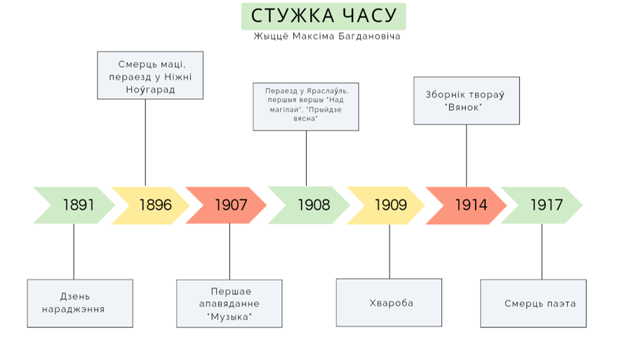 Настаўнік прапануе звярнуцца да стужкі часу. На ёй размешчаны вызначальныя даты ў біяграфіі Максіма Багдановіча. Абапіраючыся на веды па гісторыі, вучням трэба назваць падзеі, якія змянілі жыццё ўсёй краіны, і як яны паўплывалі на біяграфію паэта.