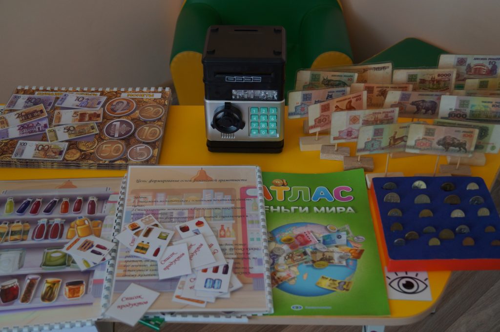 Шмат створана рукамі педагогаў, напрыклад, дыдактычная гульня “Супермаркет”. Падчас гульні дзецям выдаецца спіс прадуктаў, якія трэба купіць, і пэўная сума грошай. На ўсе пакупкі грошай не хопіць, і яны самі павінны выбраць, што купіць важней, а ад чаго можна адмовіцца. Для азнаямлення з фінансавымі тэрмінамі выкарыстоўваюцца кубікі Блума. Тут настолькі ўсё арганізавана для развіцця дзяцей, што нават дыван на падлозе складзены ў выглядзе пазлаў: дзеці разбіраюць іх і могуць сабраць у рознай паслядоўнасці, што развівае лагічнае мысленне.