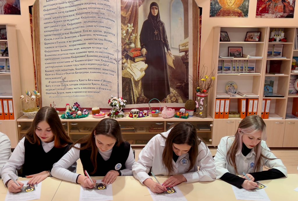 Напрыканцы ўрока настаўніцы прапанавалі школьнікам уявіць, што ў іх ёсць унікальная магчымасць напісаць некалькі слоў самой Еўфрасінні Полацкай, штосьці спытаць у яе, падзякаваць. Запісаць свае думкі можна было ў паштоўках, якія пасля размяшчаліся на дошцы. Так, напрыклад, вучаніца 9-га класа Валерыя Кірпічэнка напісала: «Еўфрасіння, дзякуй за ўсё добрае, што ты зрабіла! Дзякуй, што апякаеш наш родны горад! Не абмінай сваёй увагай Беларусь і далей!».